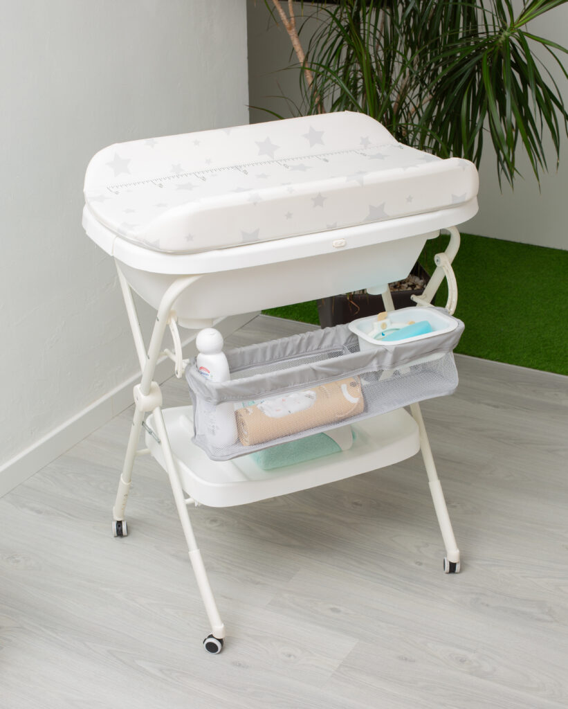 Su diseño combina una bañera ergonómica con una superficie de cambiador acolchada, logrando una experiencia cómoda, práctica y segura tanto para el bebé como para los padres.
