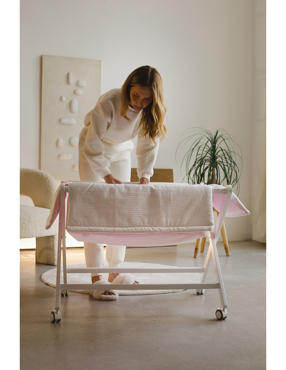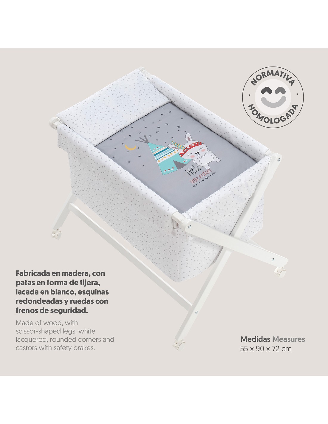 Minicuna de madera de haya con forma de tijera plegable. Incluye Textil 100 % algodón ( Vestidura + edredon + almohada) + colchón + somier + 4 patas con freno para total seguridad de tu bebé. Fácil montaje y extraordinaria movilidad por toda tu casa ya que podrás atravesar las puertas de las distintas estancias de tu casa sin problemas.