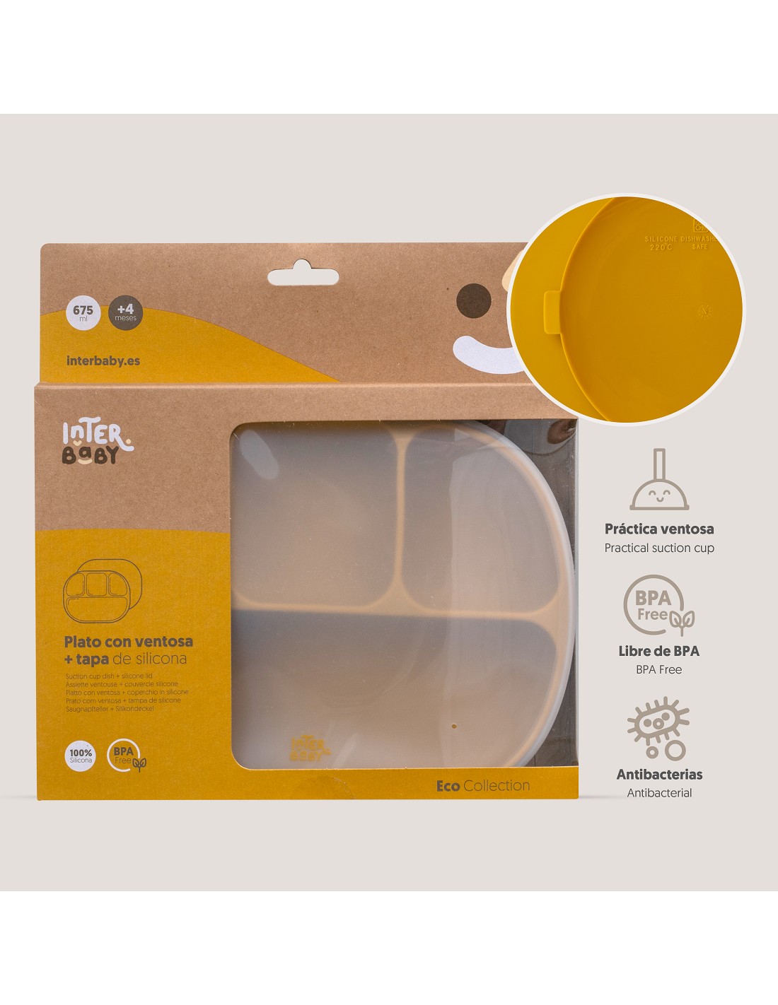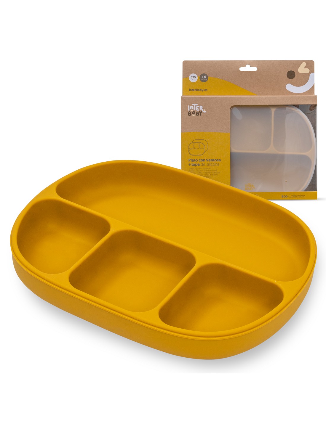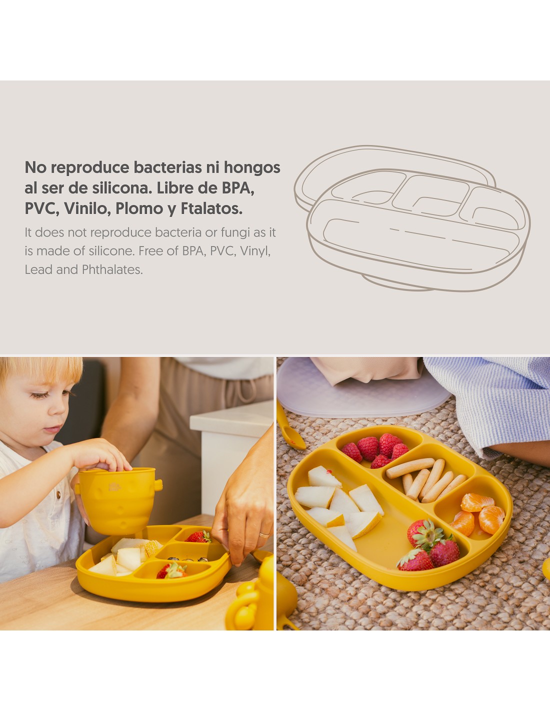 Plato de silicona que incorpora ventosas para eviatr accidentes. Dispone de 4 divisores para separar los distintos tipos de comida y que tu bebé experimente de manera individual el sabor y la textura de cada uno de ellos. Incluye tapadera para mejor conservación de la comida. Fácil limpieza y muy resistente. Libre de posibles infecciones al estar fabricado en silicona libre de BPA, PVC, Vinilo, Plomo y ftalatos. Apto para lavavajillas.
