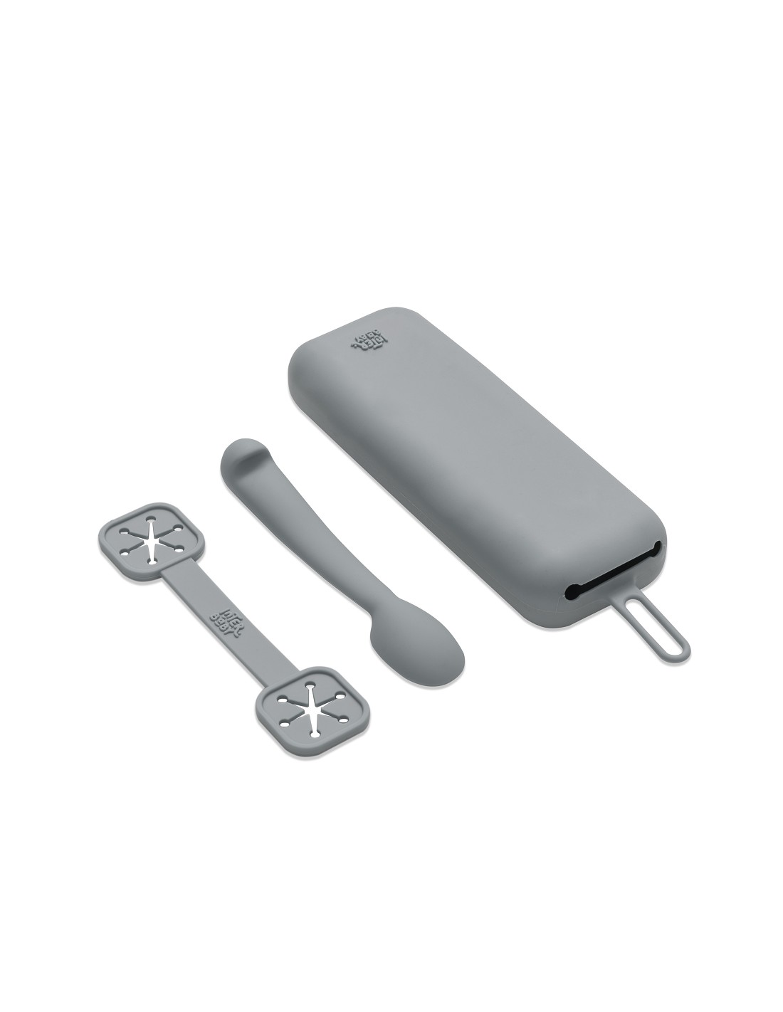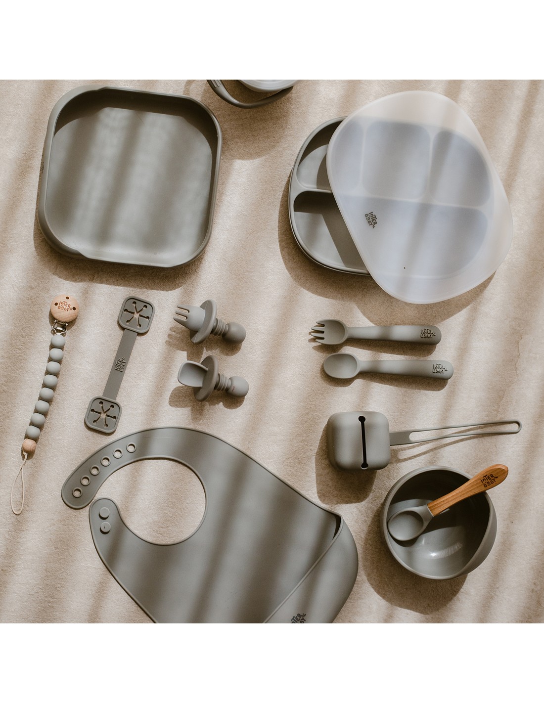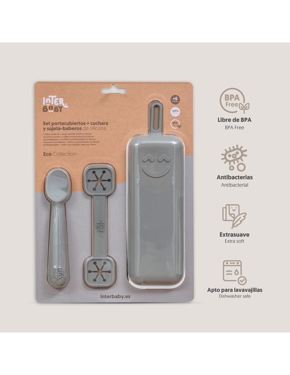Set Portacubiertos+Cuchara+Sujeta Baberos de Silicona Gris Petroleo