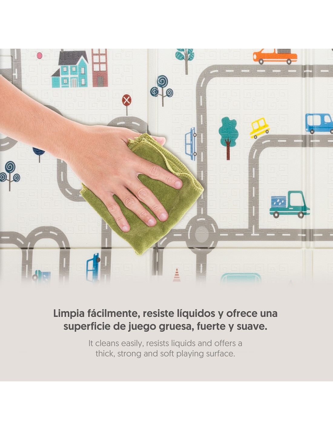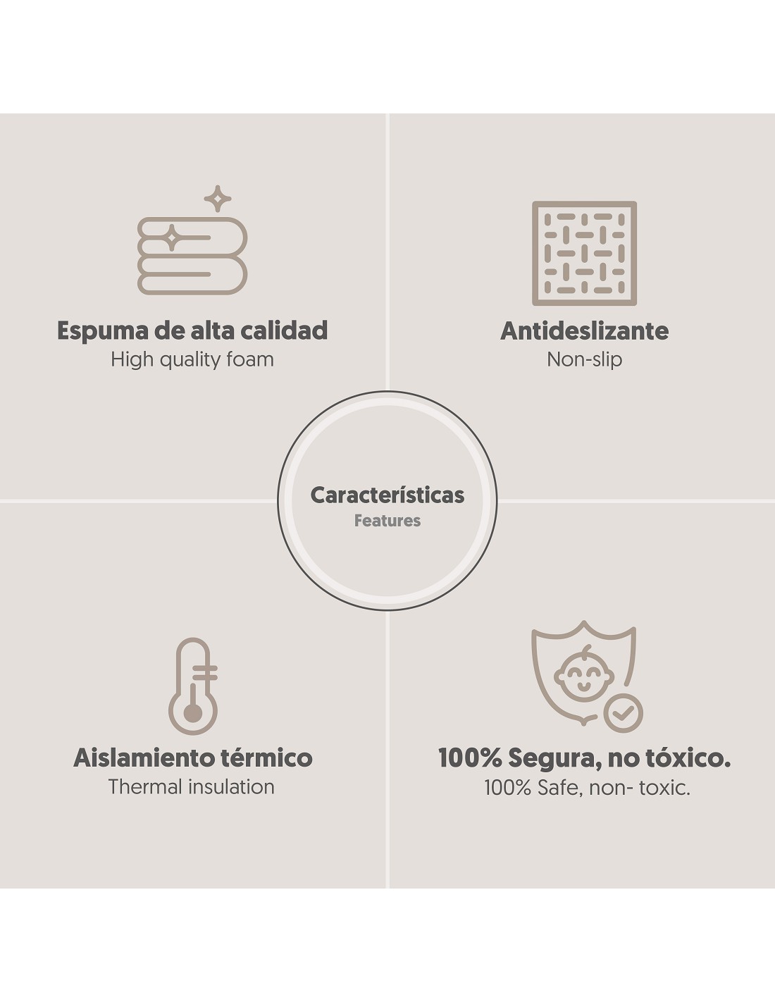 Colchoneta perfecta para que los bebes aprendan a gatear. No tiene restricciones de edad, desde los primeros meses de vida. Fabricado en espuma XPE original. Es antideslizante y se adhiere perfectamente al suelo. Reversible, un diseño diferente por cada lado de la alfombra. Impermeable y muy fácil de limpiar. Aisla del suelo frío. Excelente amortiguación en caso de caída- Puedes ser usado por personas alérgicas - Antibacteriano 100% seguro . No contiene ni Bisfenol A( BPA) . ni PVC, ni fallatos , ni formamida. Cumple todas las normativas de seguridad europeas. incluye práctica bolsa de tranporte.