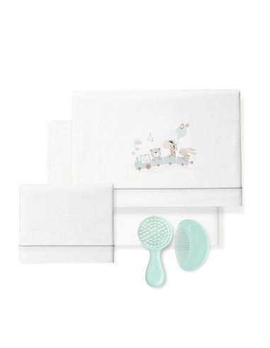Triptico Cuna 100% Algodon Mod. Jirafa Tren+Kit Peine y Cepillo Bco/Verde
