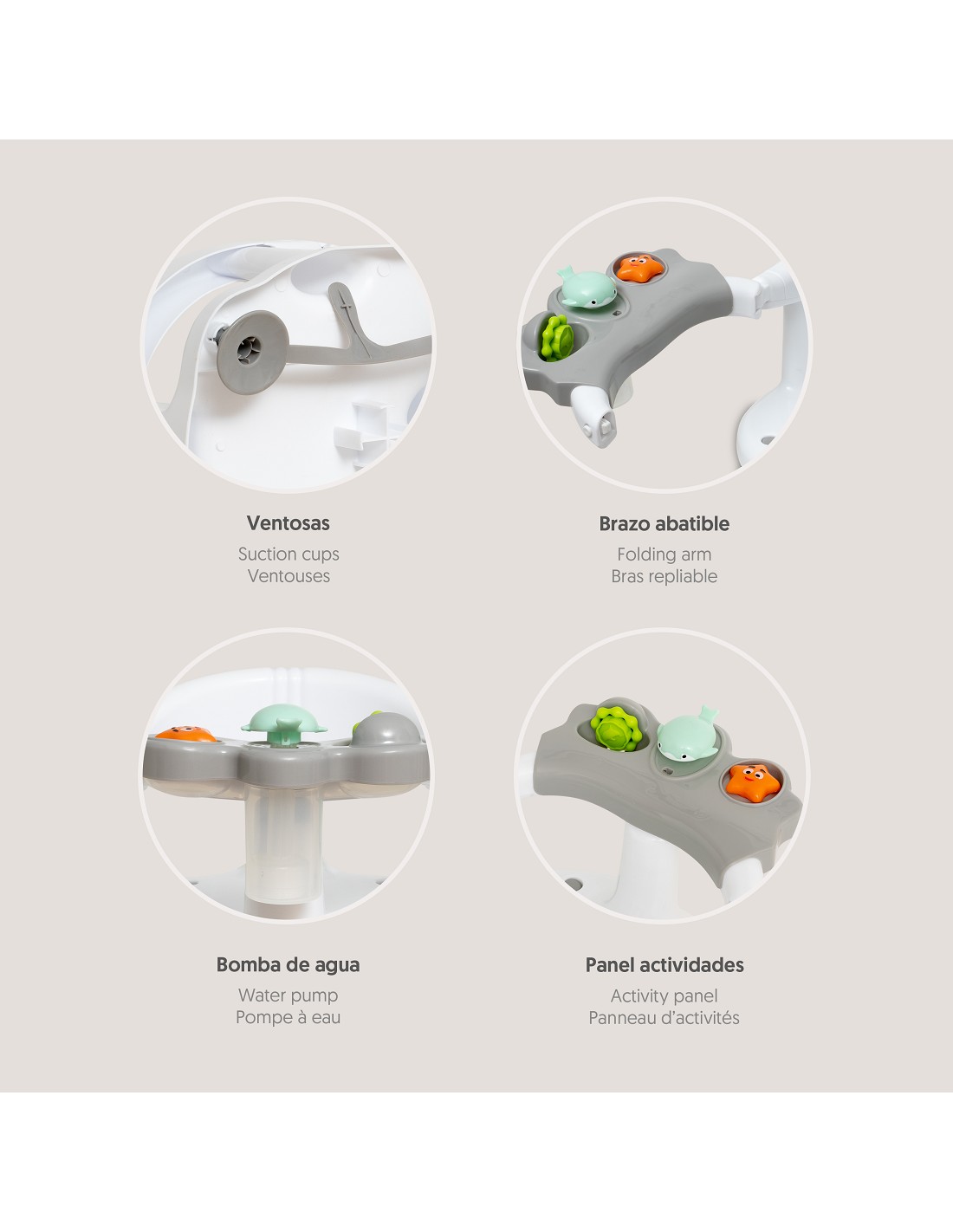 Asiento bañera con 4 ventosas + panel actividades + brazo abatible + bomba de agua+ mayores de 5 meses