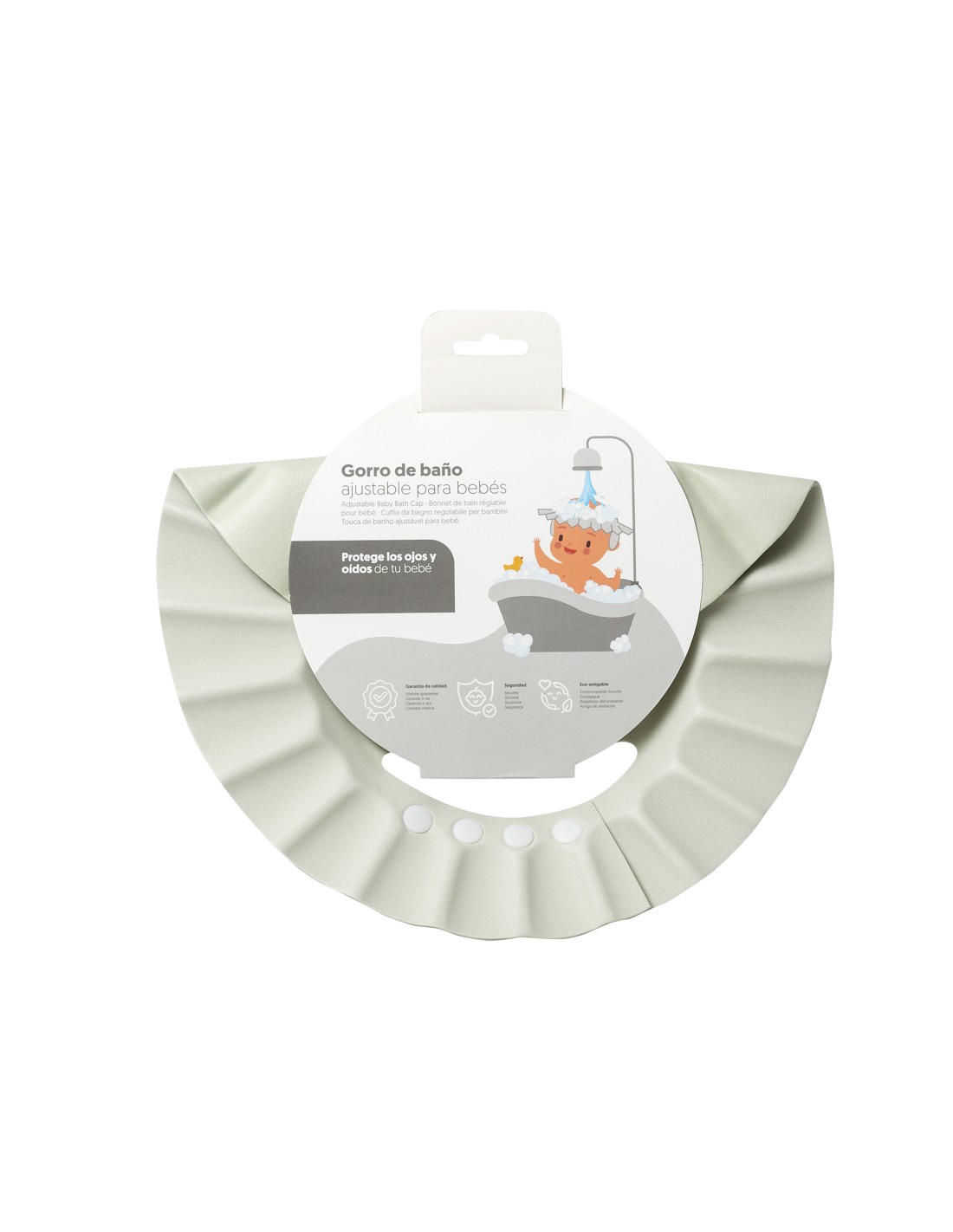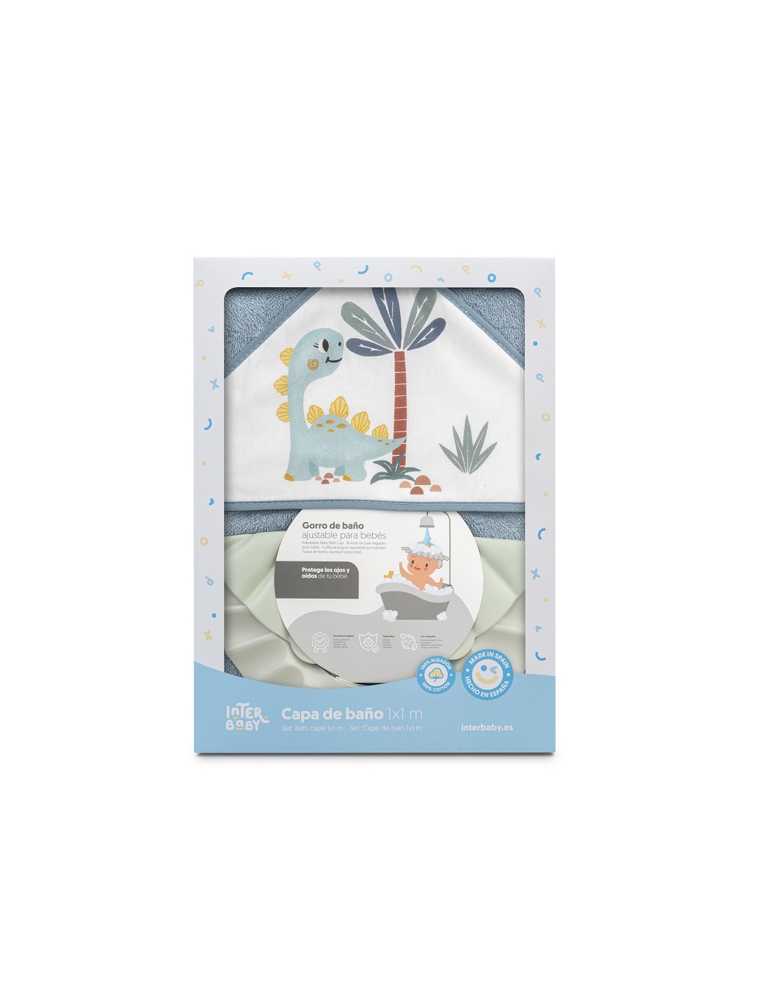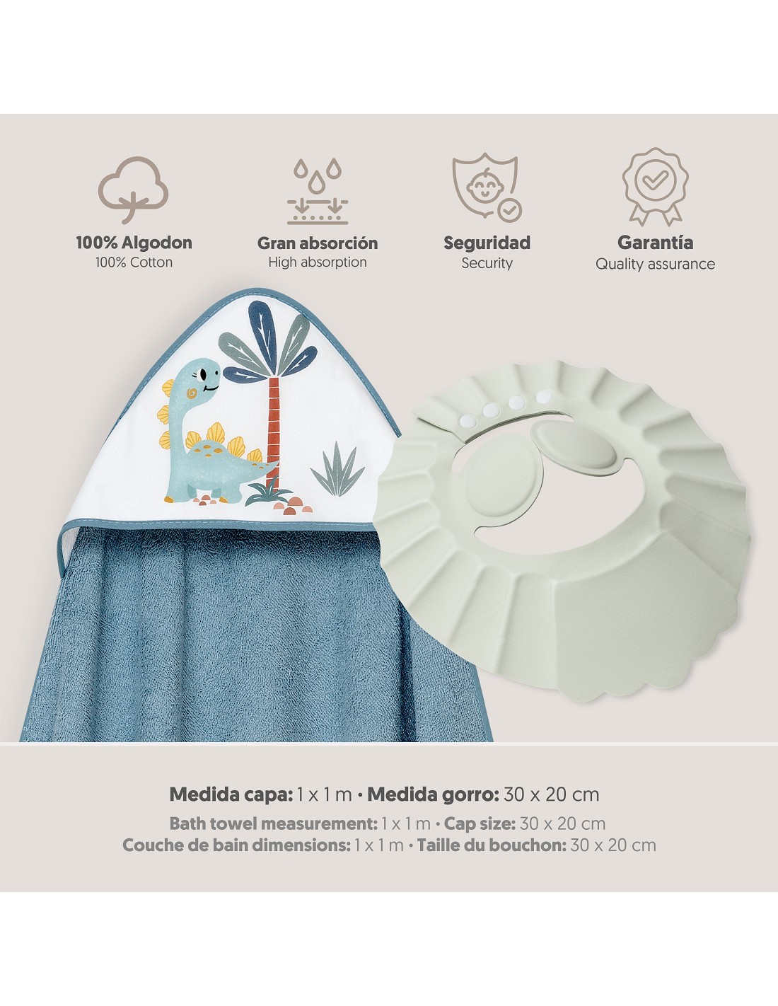 Capa de baño 100 % algodón. Idela para secar a tu bebé despues de su baño. Secado rápido y confortable. Incluye un práctico gorro de ducha que evitará picores en los ojos tras recibir su baño.