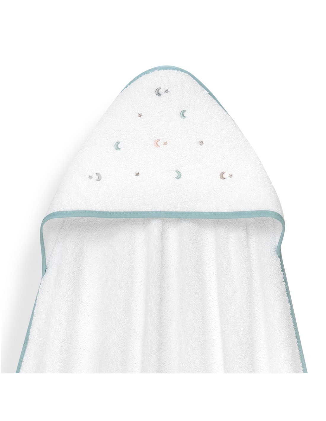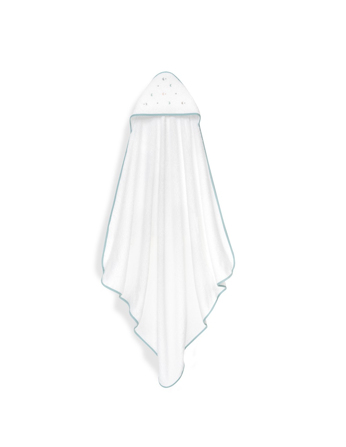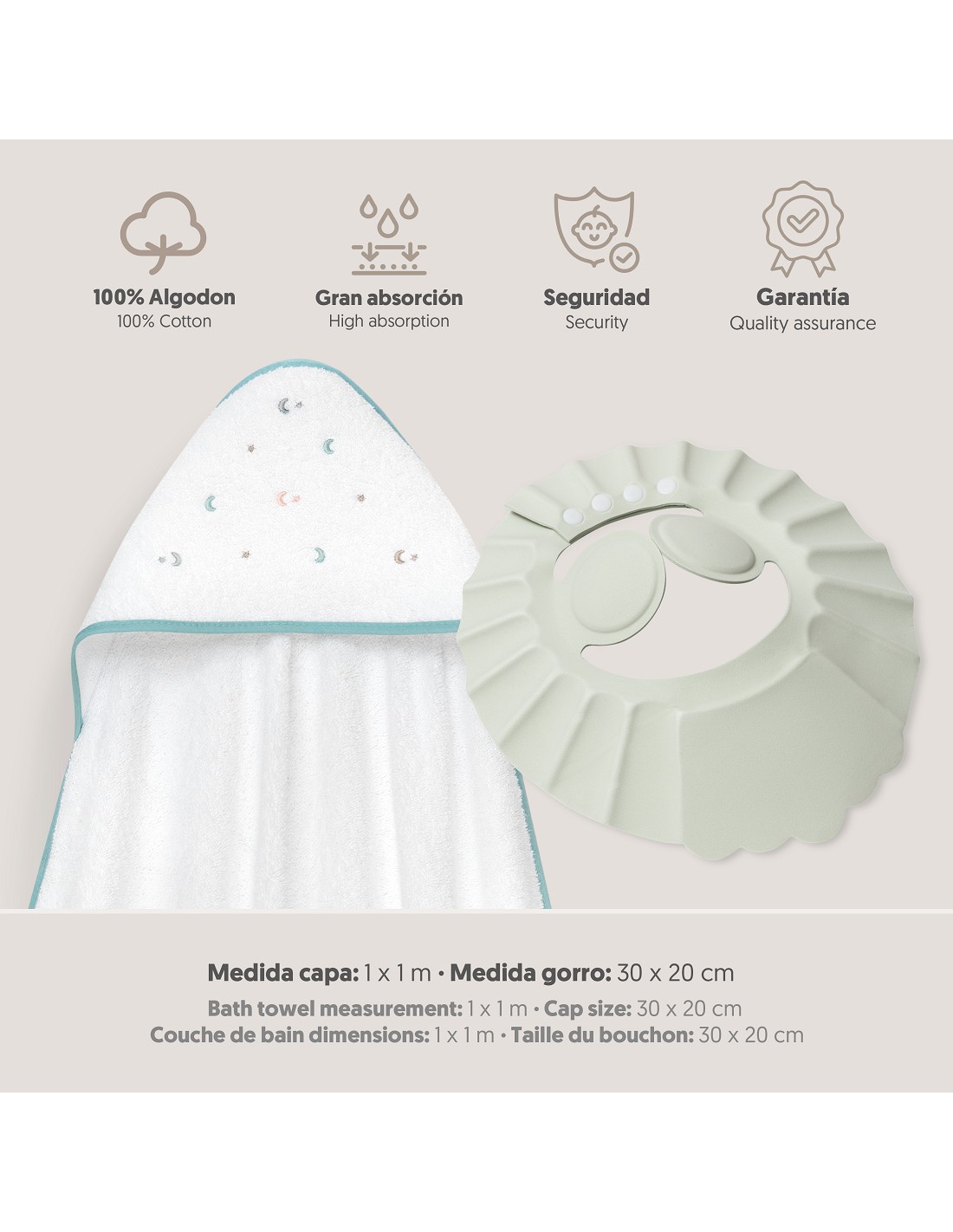 Capa de baño 100 % algodón. Idela para secar a tu bebé despues de su baño. Secado rápido y confortable. Incluye un práctico gorro de ducha que evitará picores en los ojos tras recibir su baño.