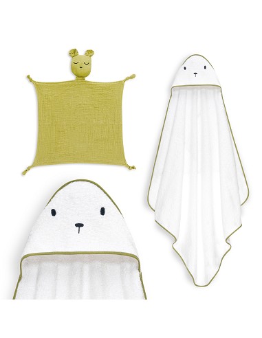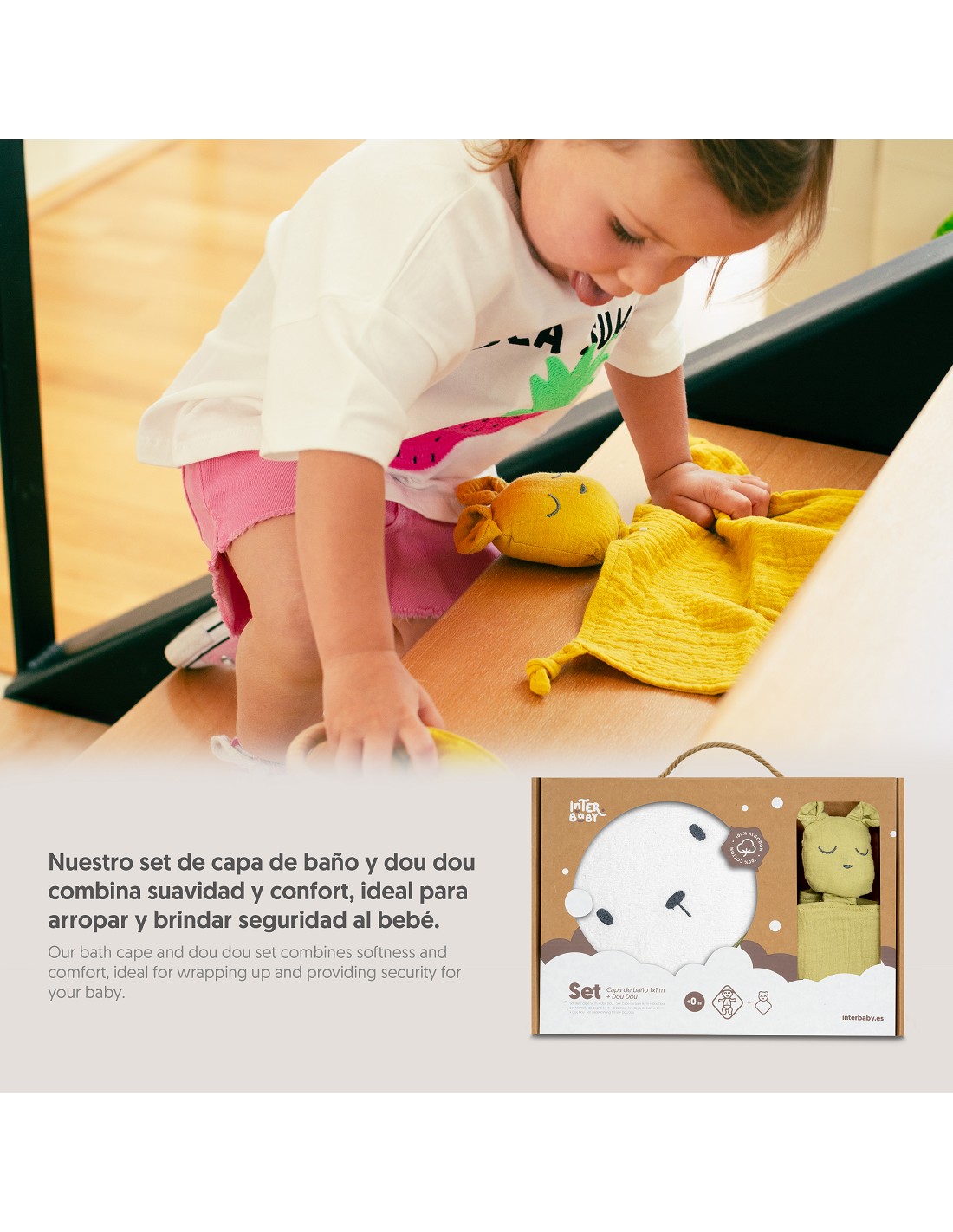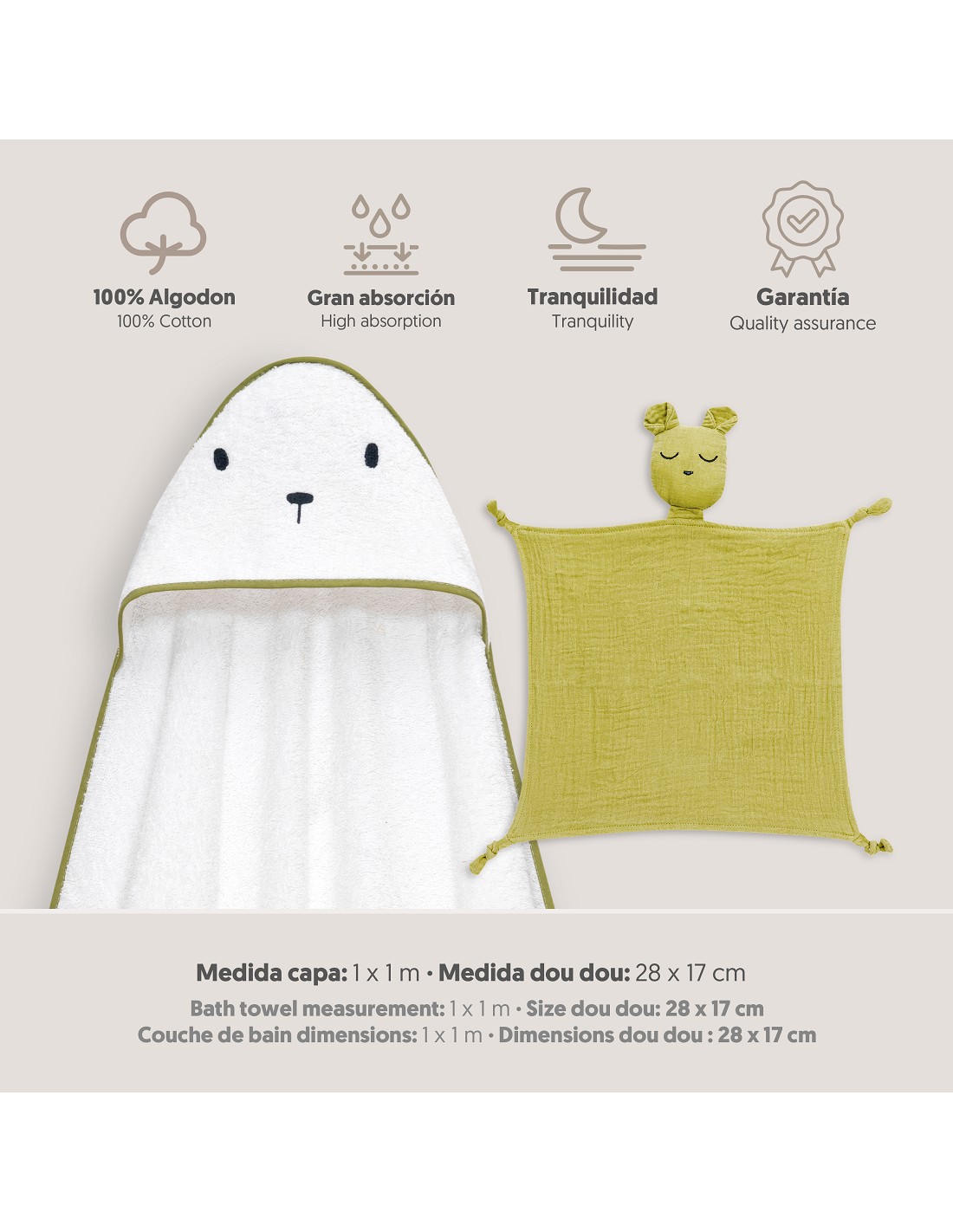 Capa de baño 100 % algodón. Idela para secar a tu bebé despues de su baño. Secado rápido y confortable. Incluye bonito dou dou de regalo para que tu bebe se entretenga con su juguete preferido mientras le secas.