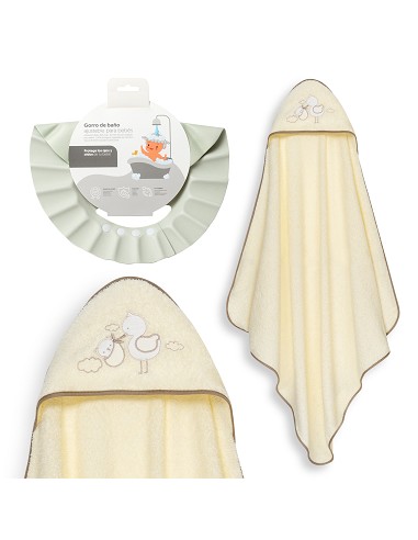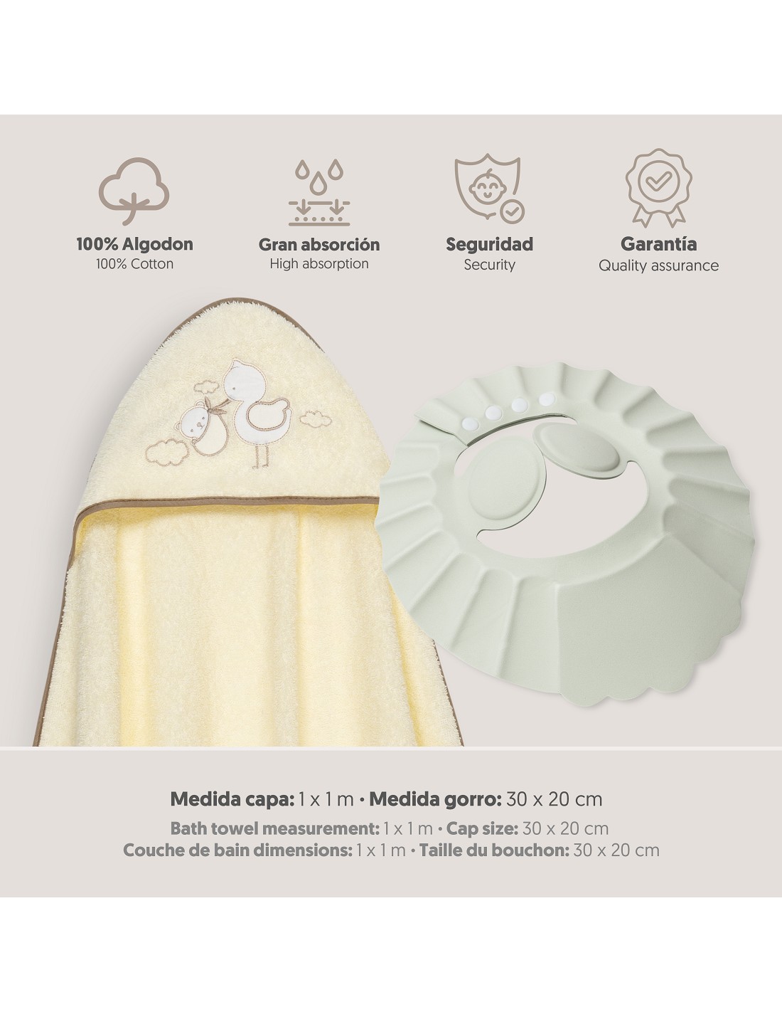 Capa de baño 100 % algodón. Idelal para secar a tu bebé despues de su baño. Secado rápido y confortable. Incluye práctico gorrito de baño para proteger los ojos de tu bebé y evitar irritaciones.