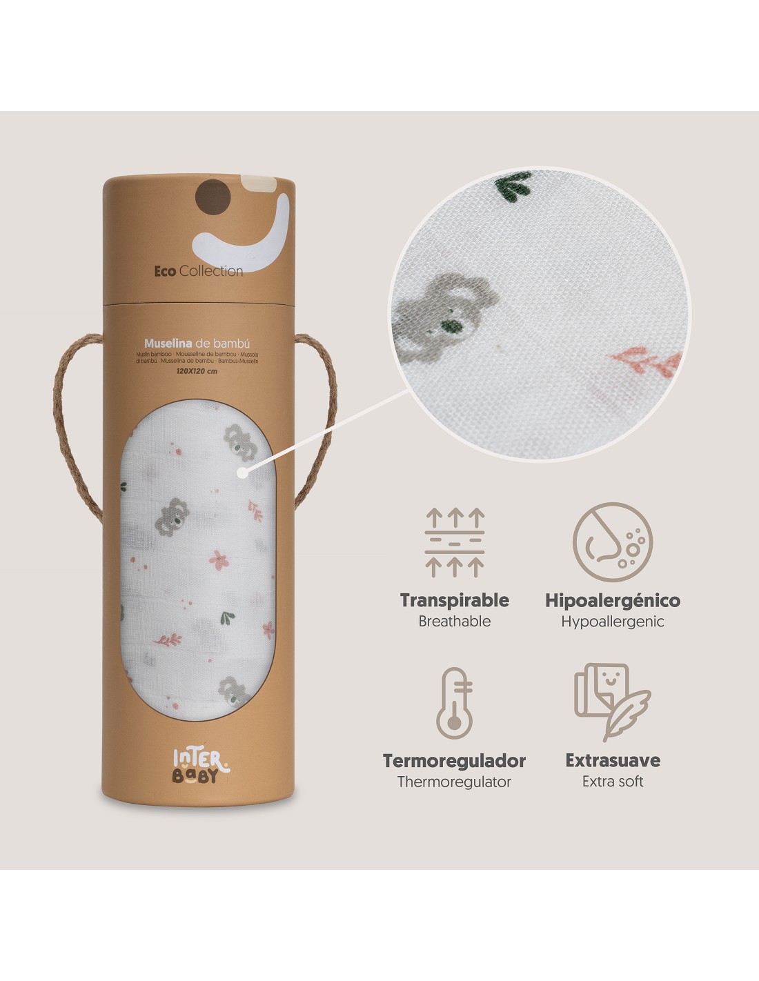 Gasa fabricada en fibra de bambú natural, tacto extrasuave, transpirable para el confort de tu bebe en verano, muy útil tanto para dar el pecho, como para el carrito de paseo y acomodarle por la noche.