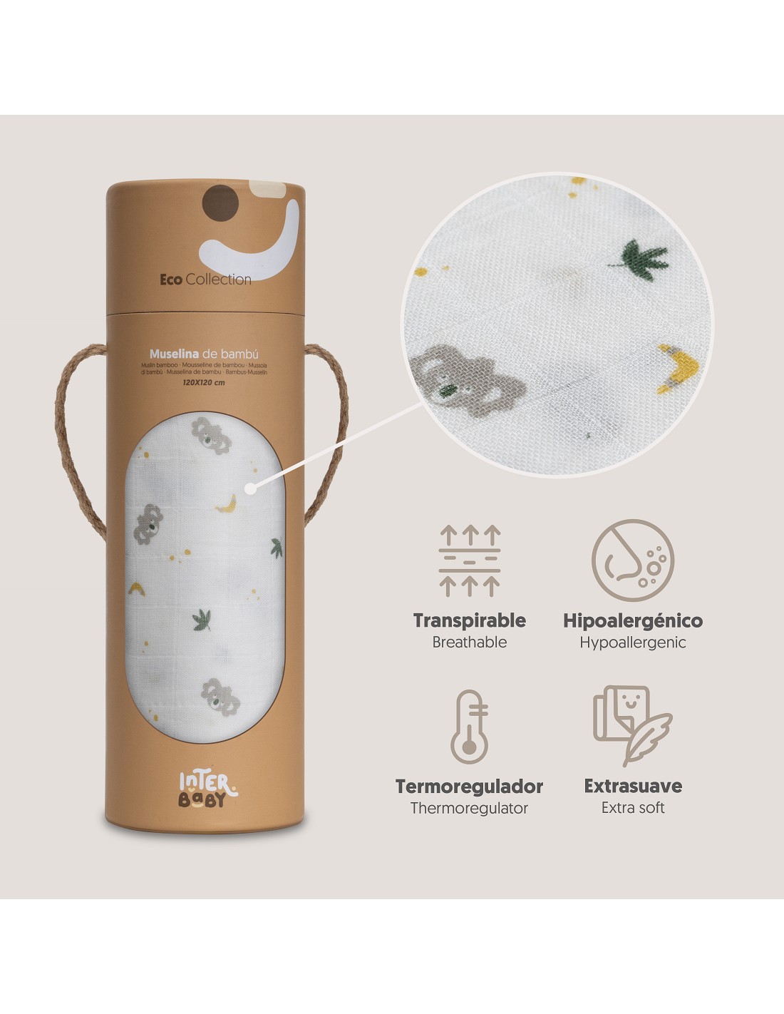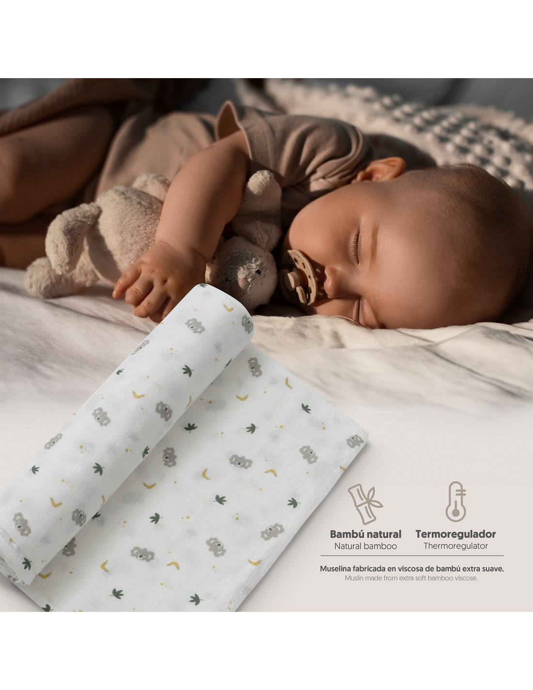 Gasa fabricada en fibra de bambú natural, tacto extrasuave, transpirable para el confort de tu bebe en verano, muy útil tanto para dar el pecho, como para el carrito de paseo y acomodarle por la noche.