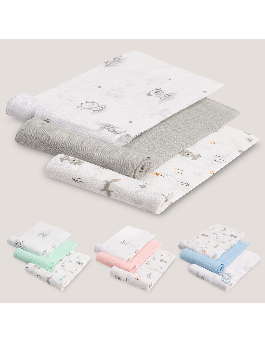 PACK DE 3 .Gasa fabricada en algodónl, tacto extrasuave, transpirable para el confort de tu bebe en verano, muy útil tanto para dar el pecho, como para el carrito de paseo y acomodarle por la noche.