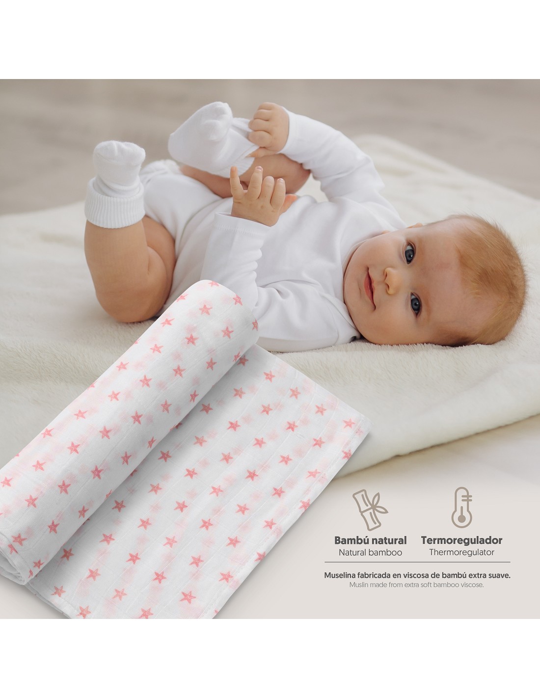 Gasa fabricada en fibra de bambú natural, tacto extrasuave, transpirable para el confort de tu bebe en verano, muy útil tanto para dar el pecho, como para el carrito de paseo y acomodarle por la noche.