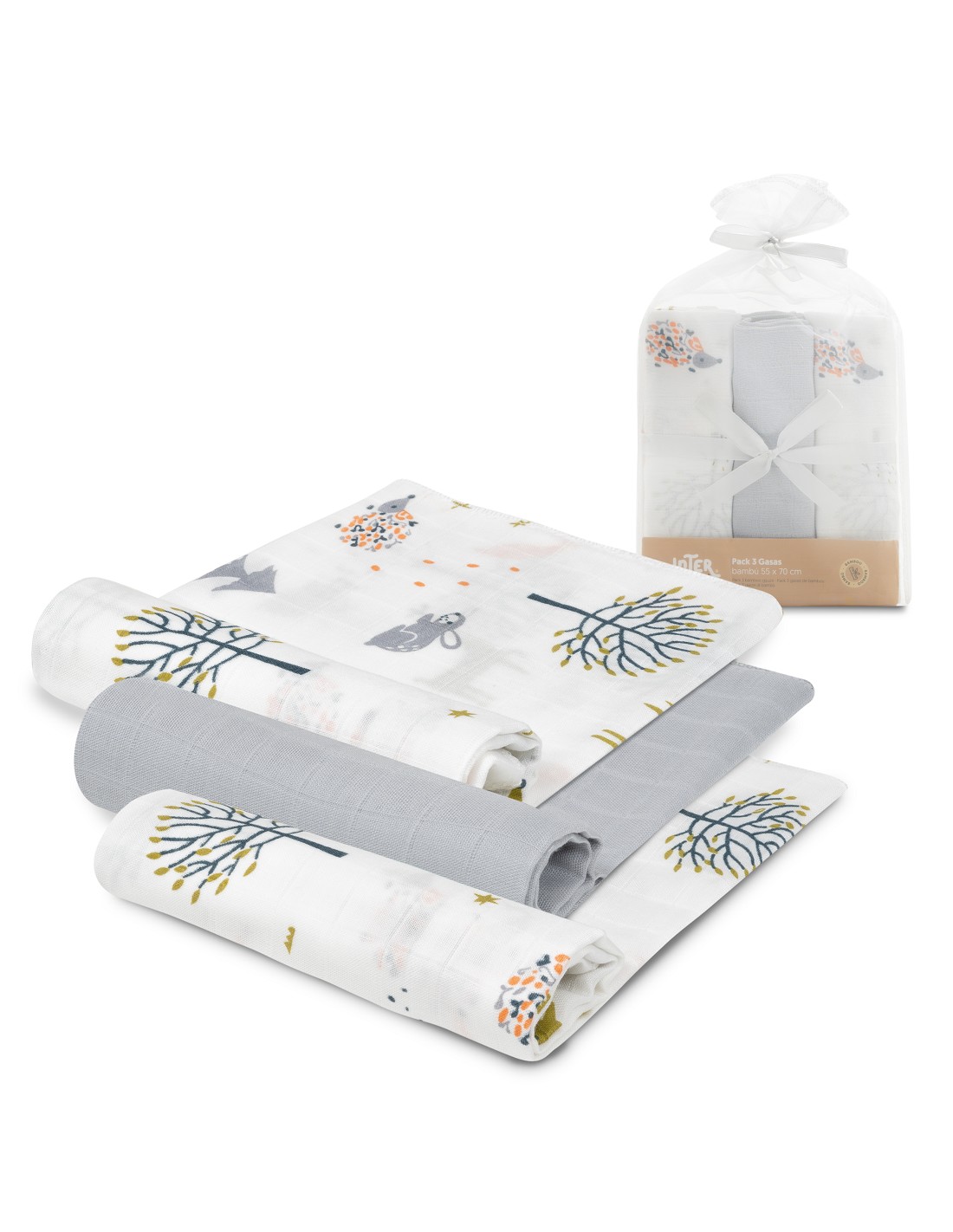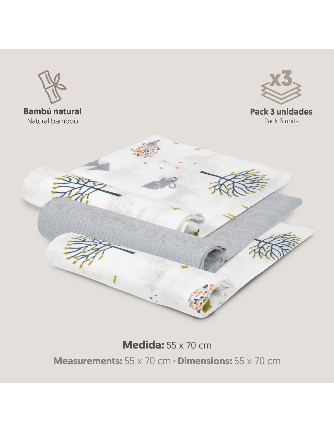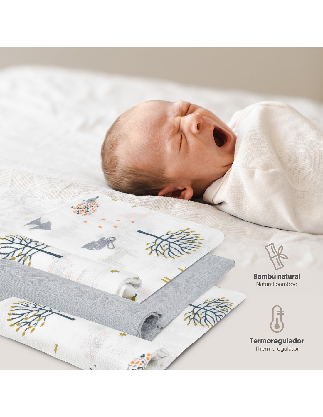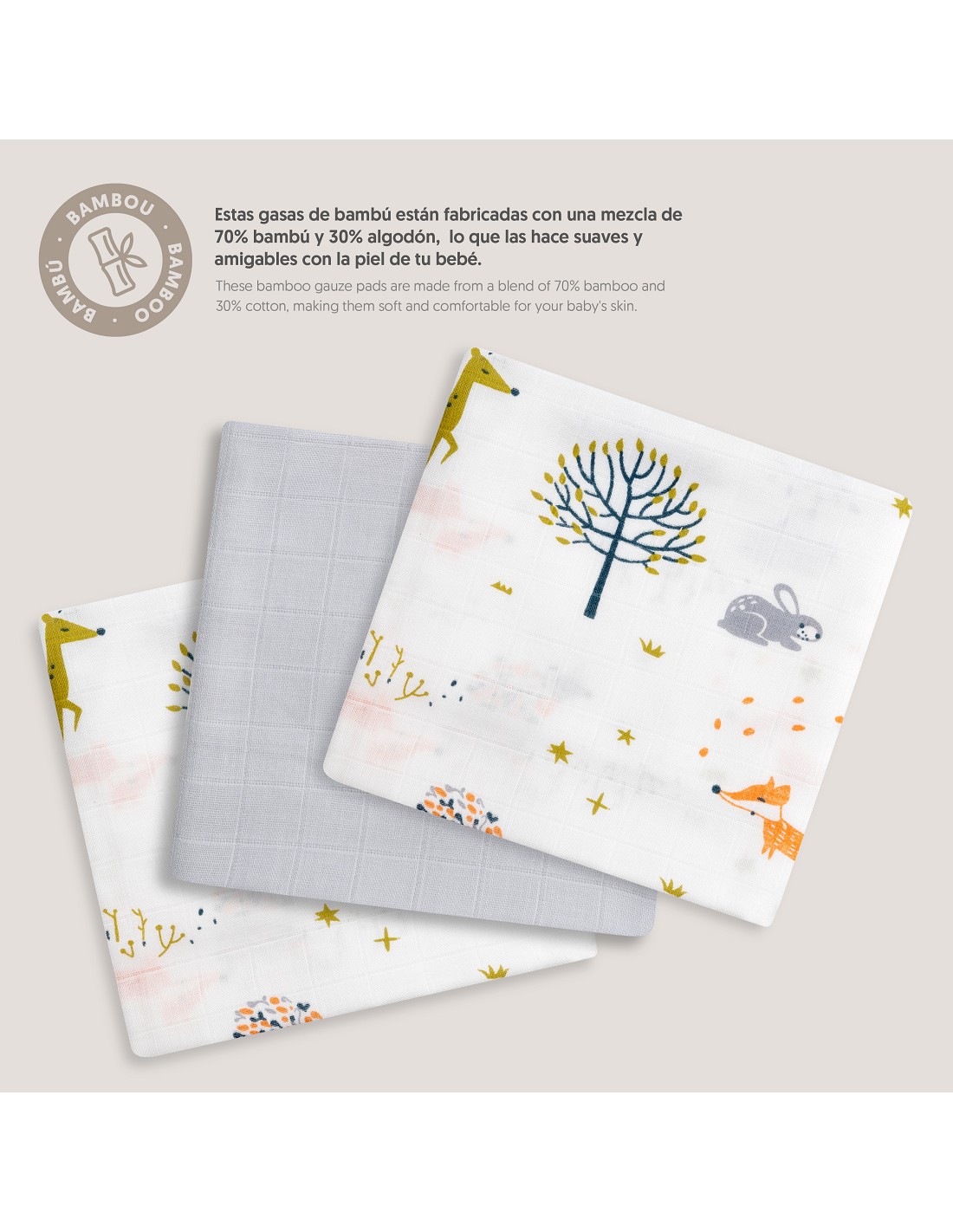 PACK DE 3 .Gasa fabricada en fibra de bambú natural, tacto extrasuave, transpirable para el confort de tu bebe en verano, muy útil tanto para dar el pecho, como para el carrito de paseo y acomodarle por la noche.