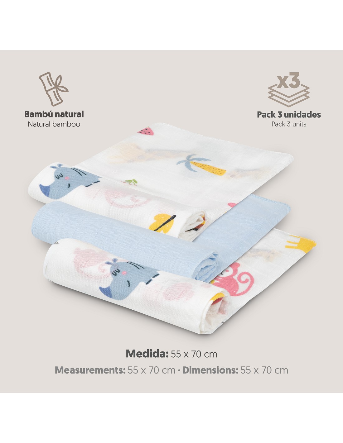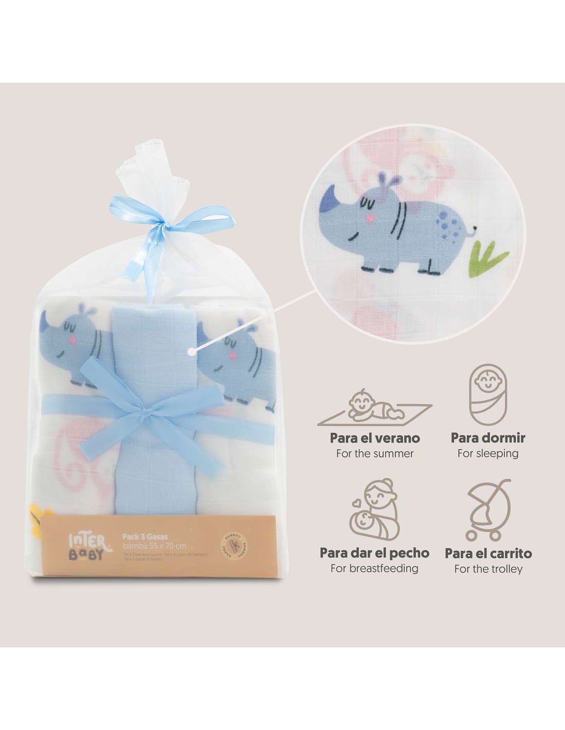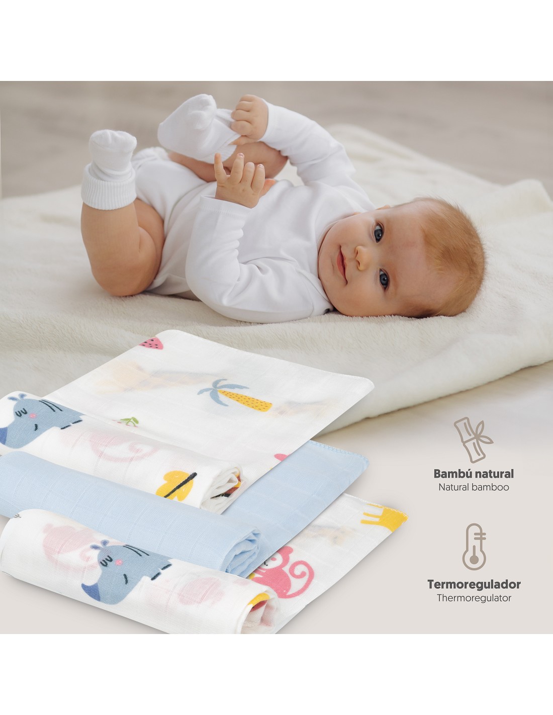 PACK DE 3 .Gasa fabricada en fibra de bambú natural, tacto extrasuave, transpirable para el confort de tu bebe en verano, muy útil tanto para dar el pecho, como para el carrito de paseo y acomodarle por la noche.