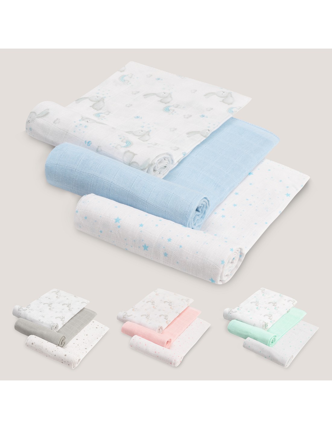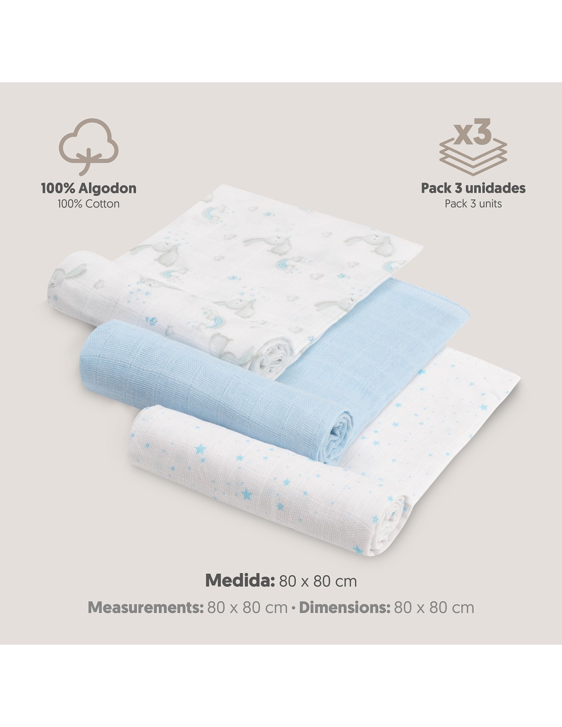 PACK DE 3 .Gasa fabricada en algodónl, tacto extrasuave, transpirable para el confort de tu bebe en verano, muy útil tanto para dar el pecho, como para el carrito de paseo y acomodarle por la noche.