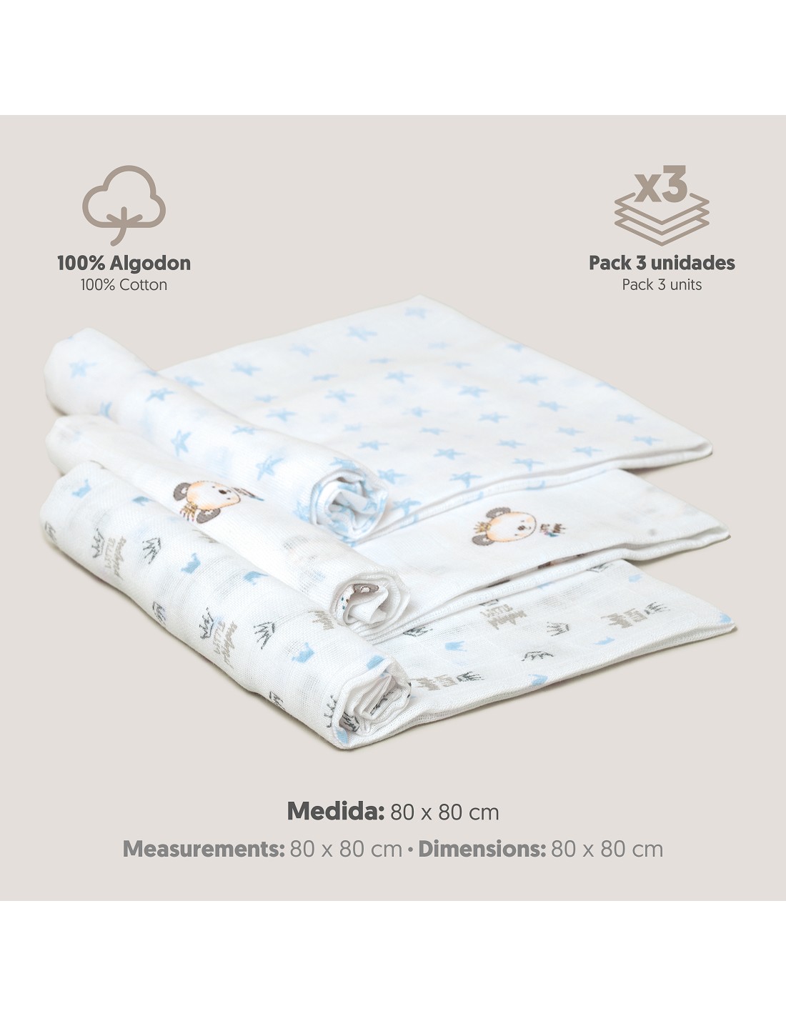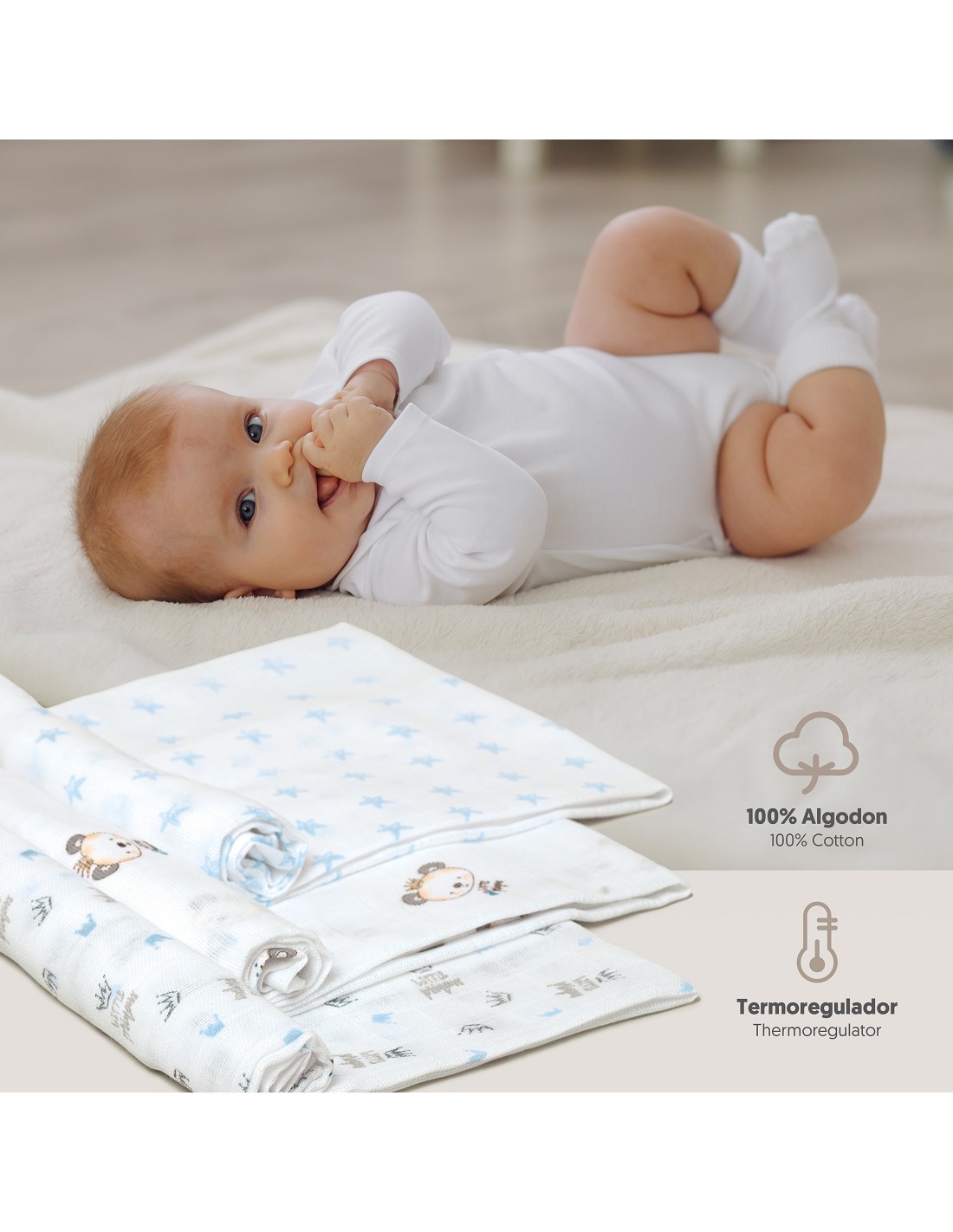 PACK DE 3 .Gasa fabricada en algodón, tacto extrasuave, transpirable para el confort de tu bebe en verano, muy útil tanto para dar el pecho, como para el carrito de paseo y acomodarle por la noche.