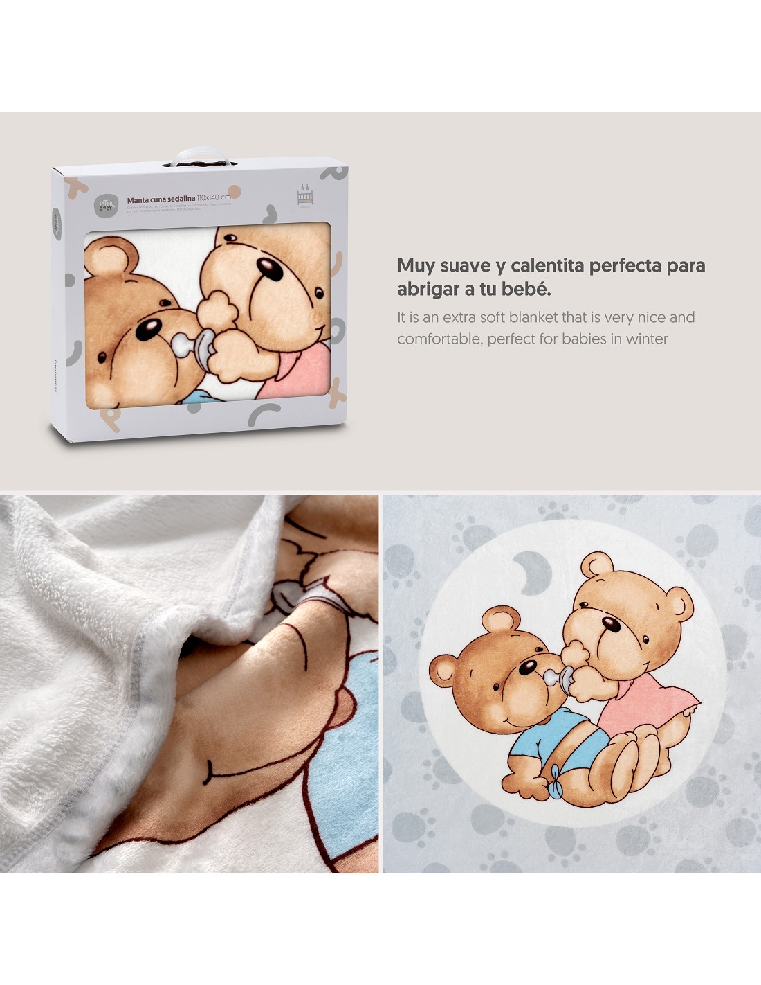 Manta de sedalina diseñada para ofrecer una suavidad excepcional, perfecta para la delicada piel de los bebes y niñis pequeños. fabricada para ofrecer la máxima calidad, durabilidad y confort, con un tacto muy suave y cálido.