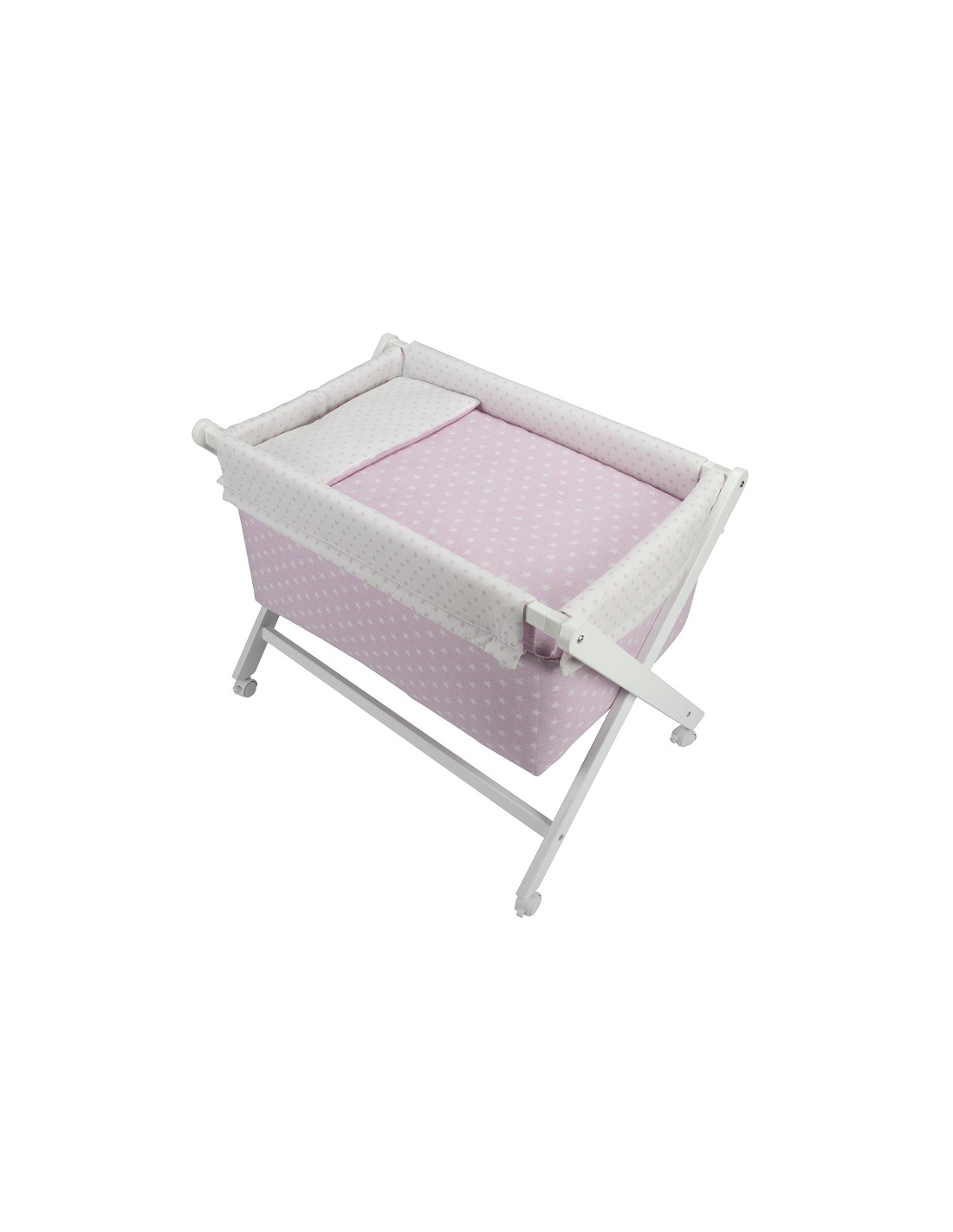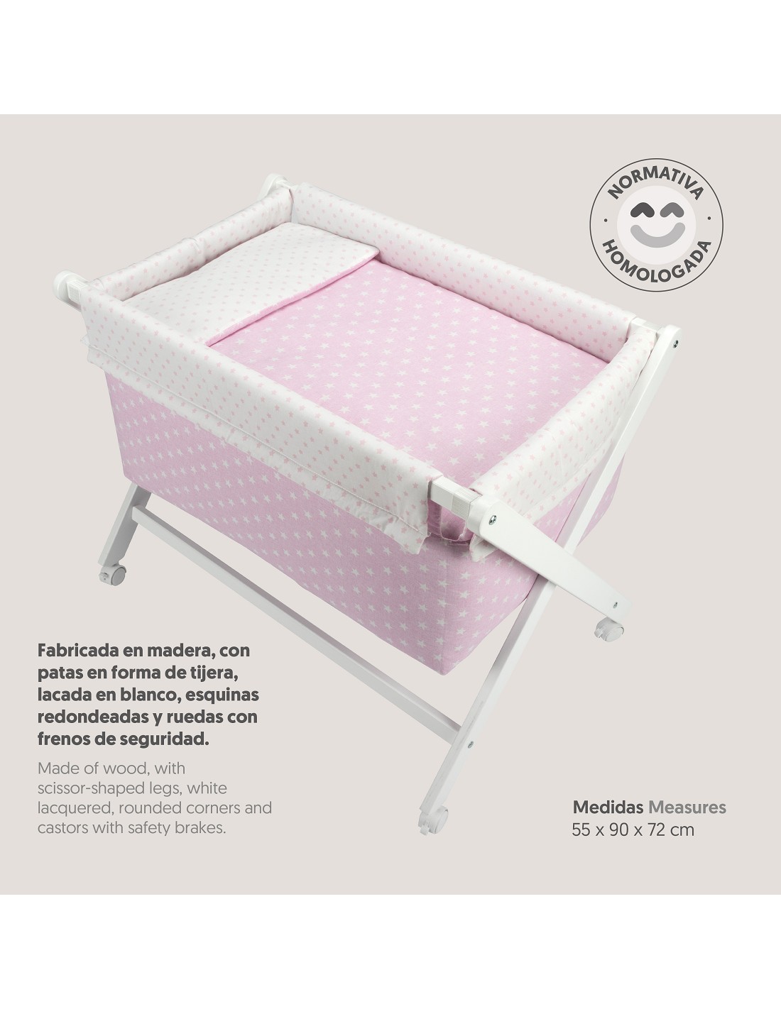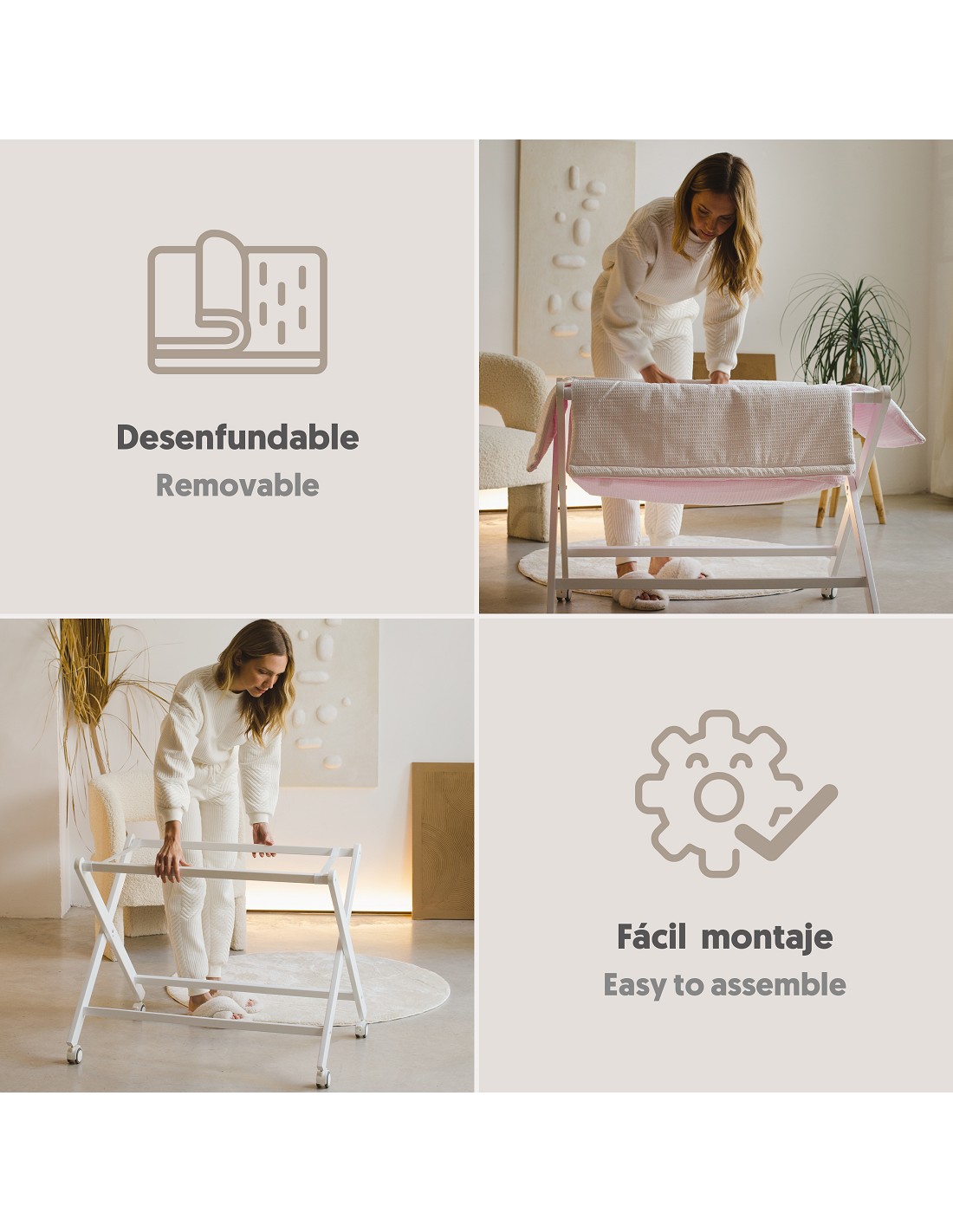 Minicuna de madera de haya con forma de tijera plegable. Incluye Textil 100 % algodón ( Vestidura + edredon + almohada) + colchón + somier + 4 patas con freno para total seguridad de tu bebé. Fácil montaje y extraordinaria movilidad por toda tu casa ya que podrás atravesar las puertas de las distintas estancias de tu casa sin problemas.