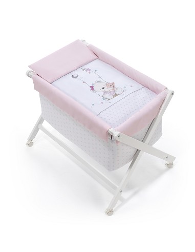 Minicuna de madera de haya con forma de tijera plegable. Incluye Textil 100 % algodón ( Vestidura + edredon + almohada) + colchón + somier + 4 patas con freno para total seguridad de tu bebé. Fácil montaje y extraordinaria movilidad por toda tu casa ya que podrás atravesar las puertas de las distintas estancias de tu casa sin problemas.