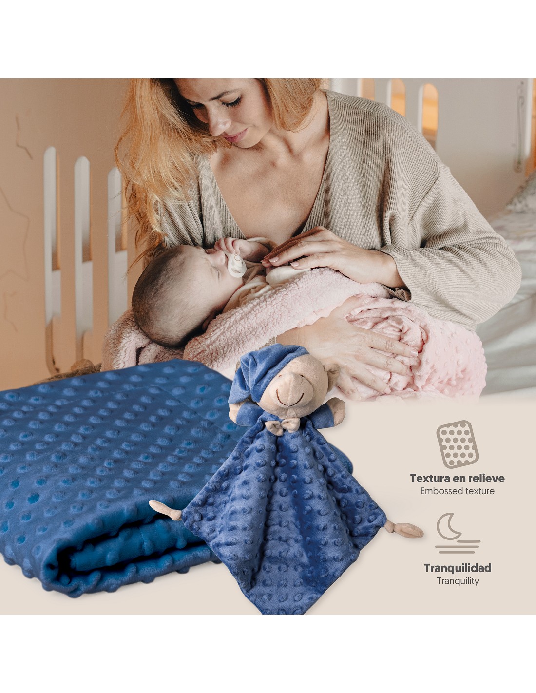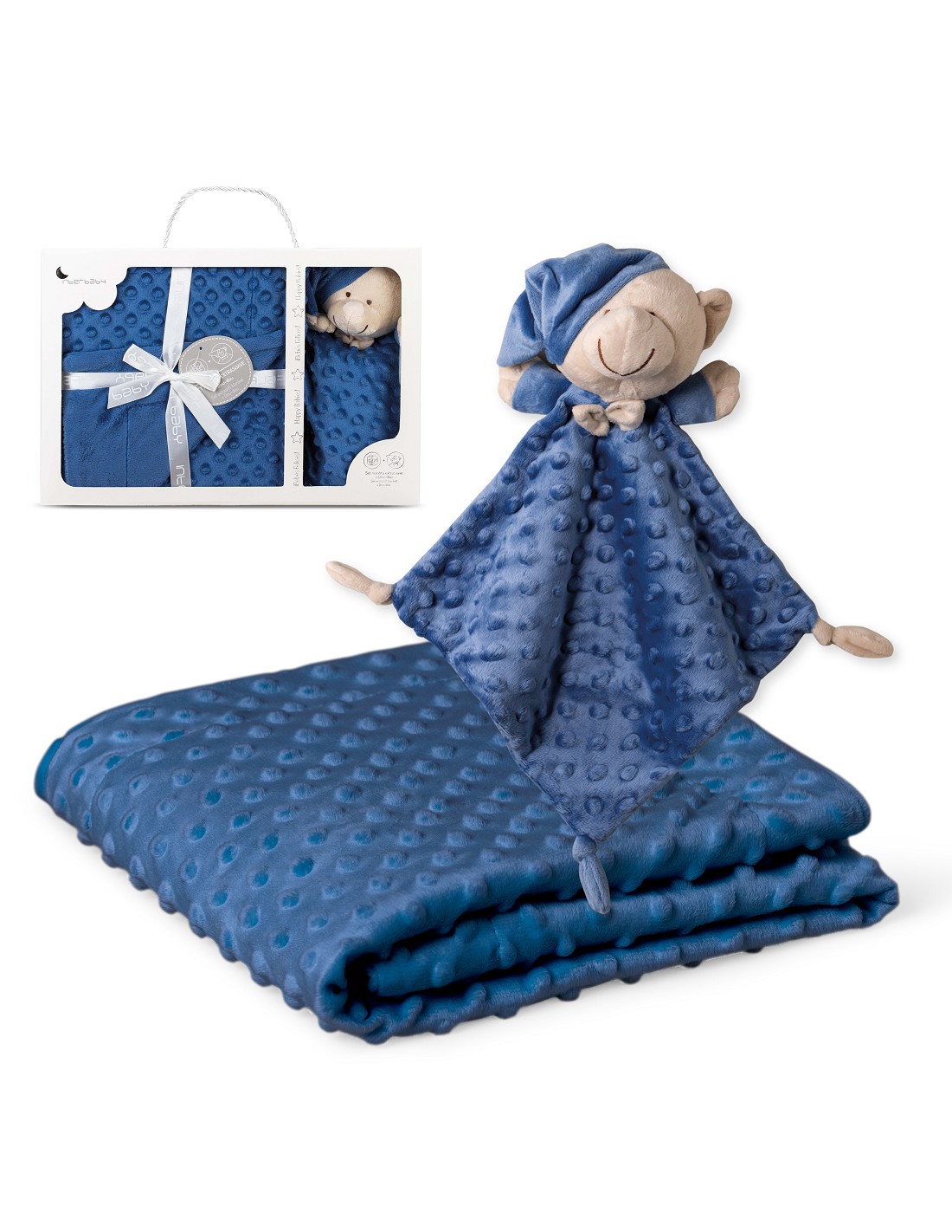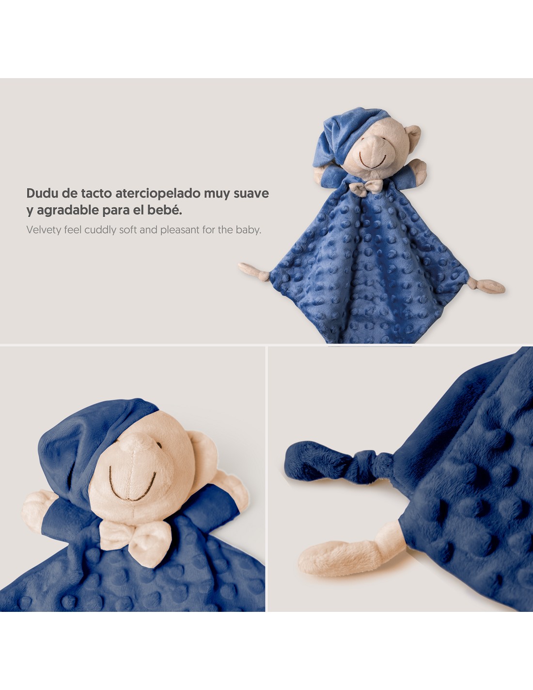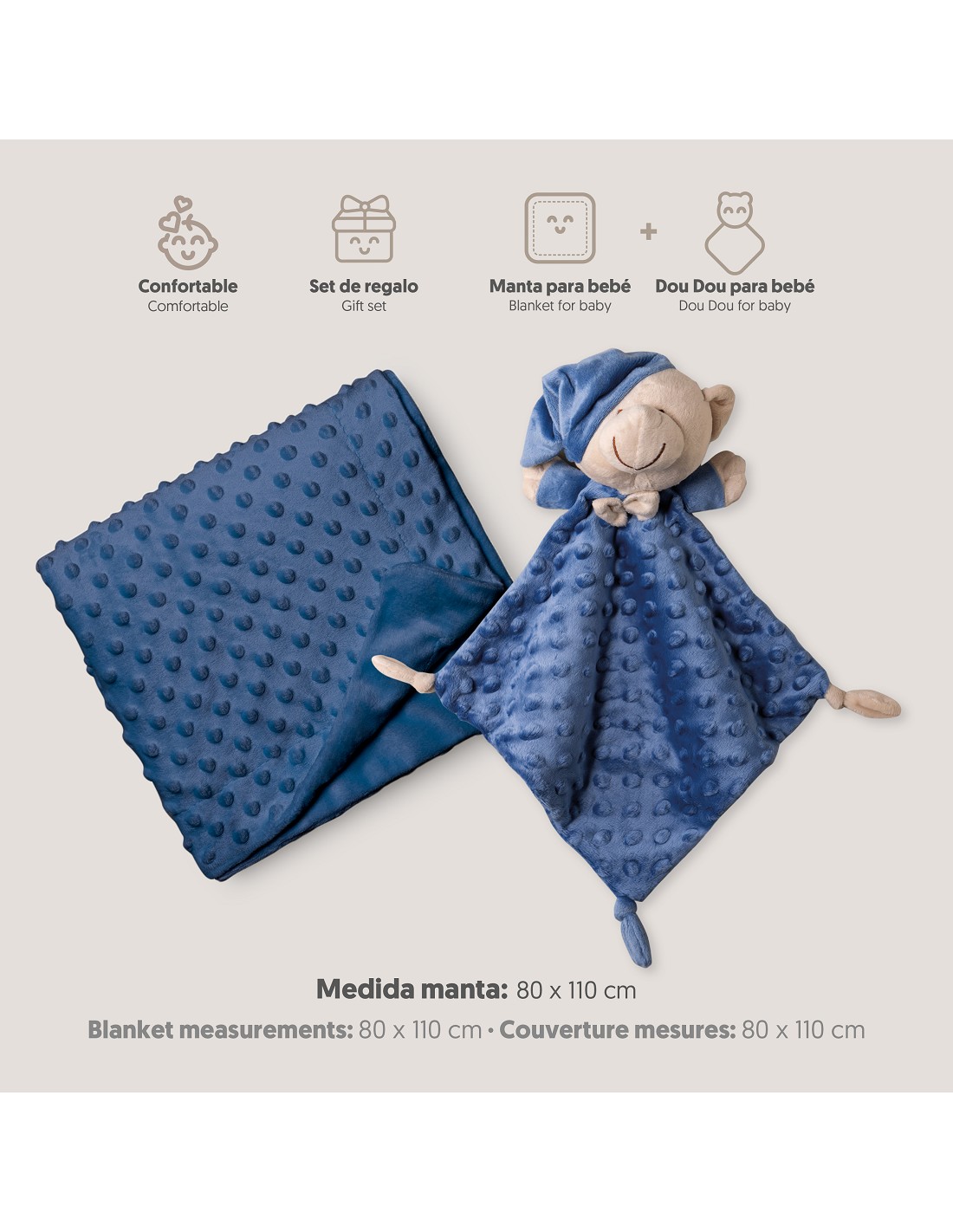 Set Manta de terciopelo para cuna acabado en borreguillo. Fabricado en microfibra de alta calidad para dotar a tu bebé de una sensación térmica muy agradable y suave al tacto. Bonito Dudu a conjunto para que acompañe a tu bebé.