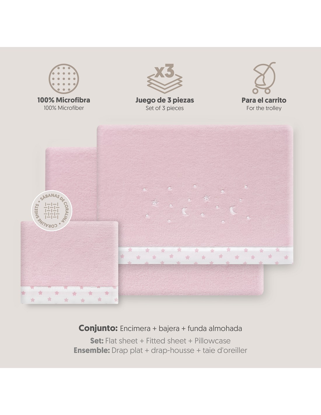 "Compuesto por encimera (72 X 114cm) , bajera (40 X 80 cm) y funda de almohada (40 x 25 cm). 100 % poliester. Lavar en frío.