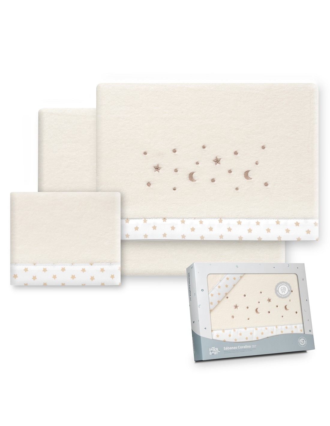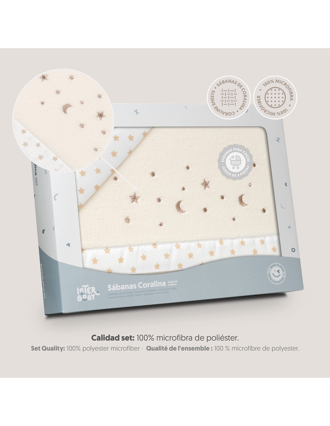 "Compuesto por encimera (72 X 114cm) , bajera (40 X 80 cm) y funda de almohada (40 x 25 cm). 100 % poliester. Lavar en frío.