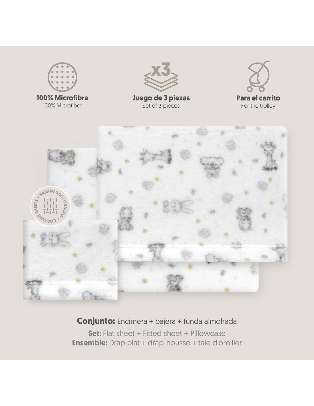 "Compuesto por encimera (72 X 114cm) , bajera (40 X 80 cm) y funda de almohada (40 x 25 cm). 100 % poliester. Lavar en frío. "