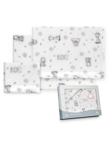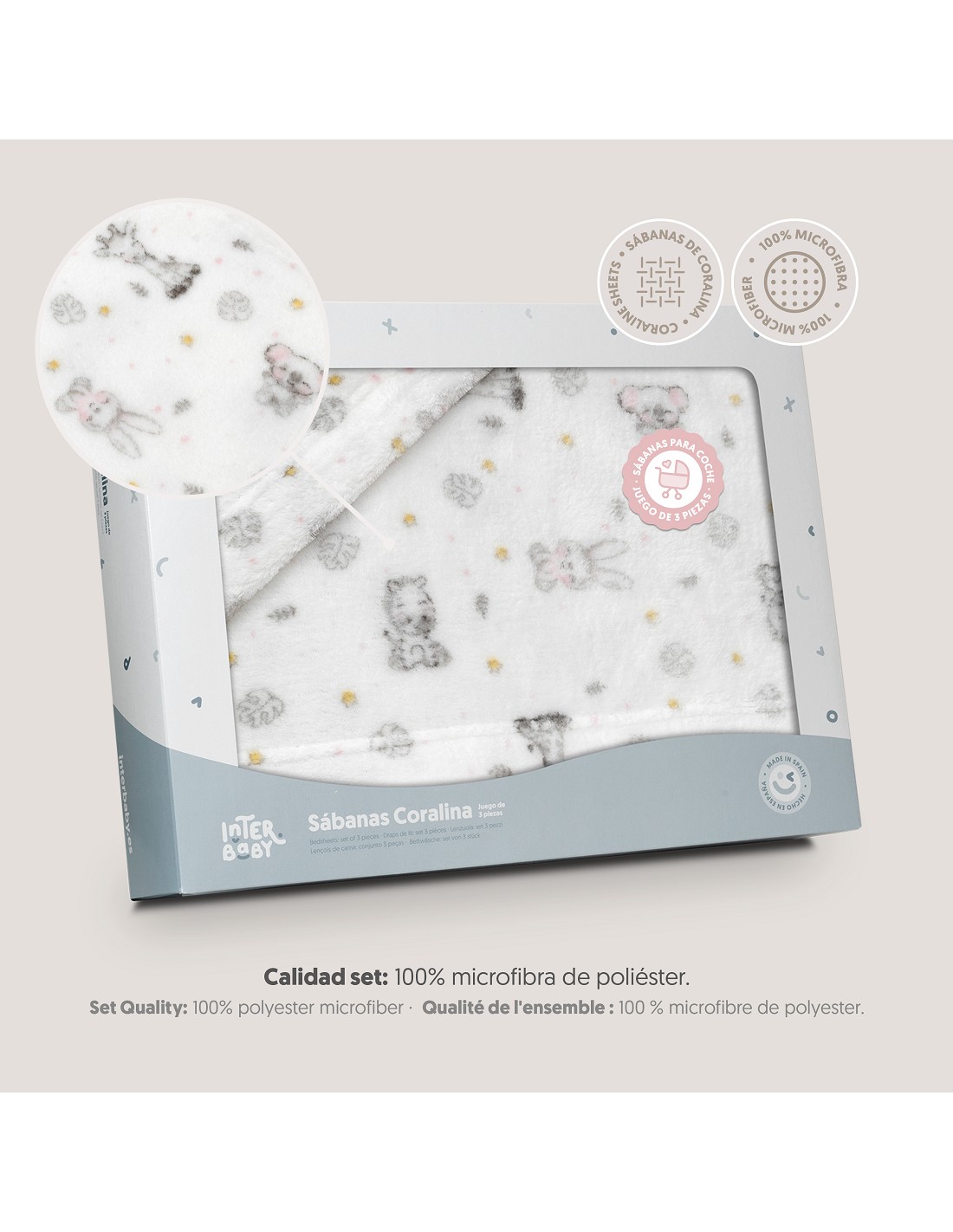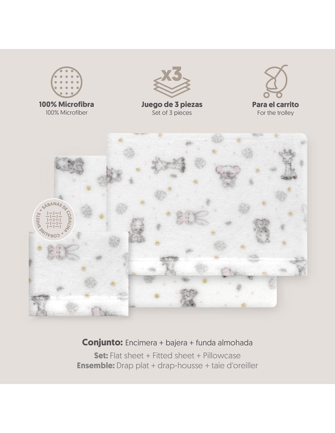 "Compuesto por encimera (72 X 114cm) , bajera (40 X 80 cm) y funda de almohada (40 x 25 cm). 100 % poliester. Lavar en frío. "