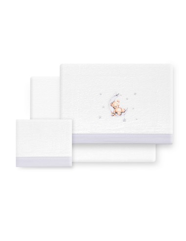"Compuesto por encimera (72 X 114cm) , bajera (40 X 80 cm) y funda de almohada (40 x 25 cm). 100 % poliester. Lavar en frío.