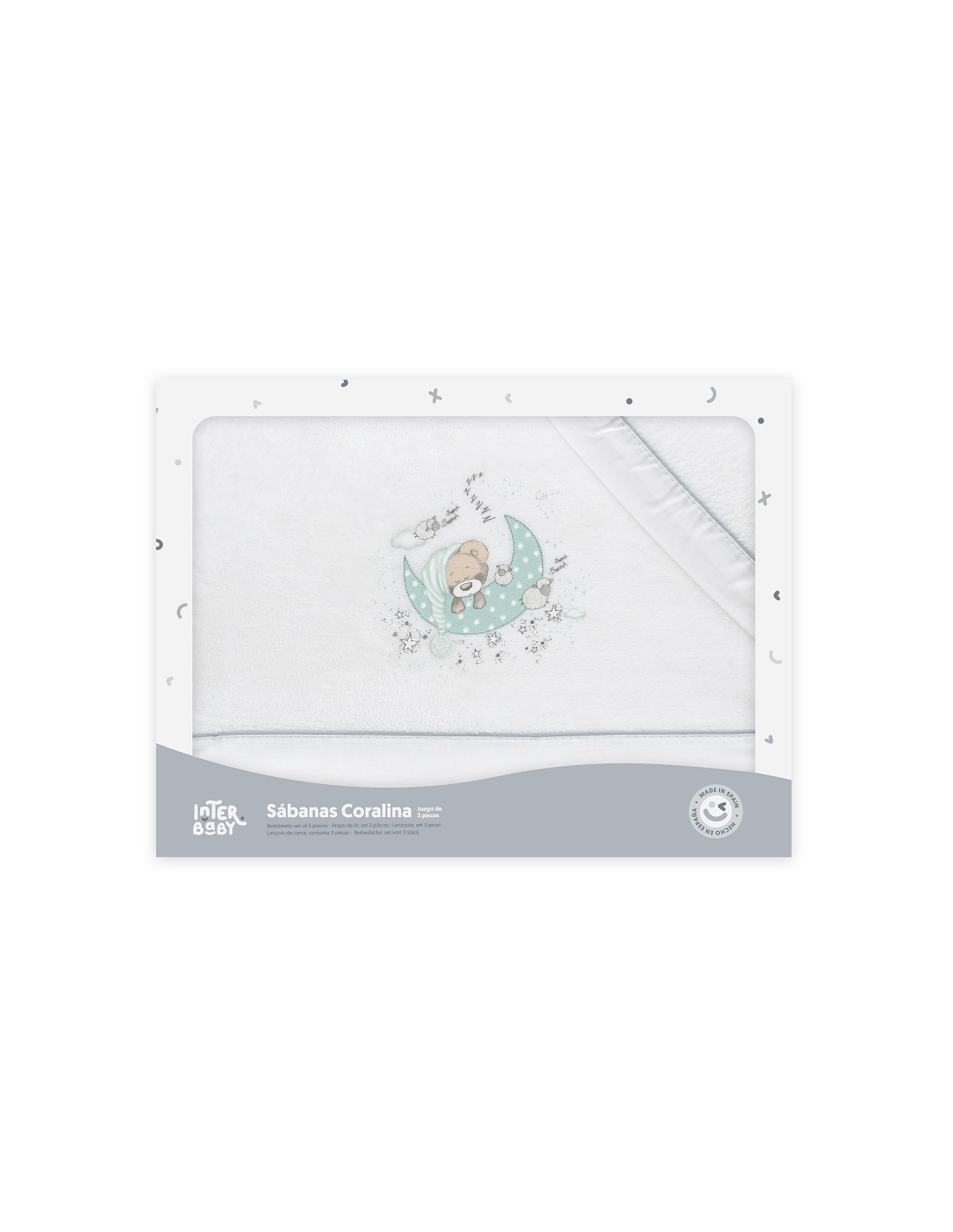 Compuesto por encimera (82 x 114 cm) , bajera (50 x 80 cm) y funda de almohada (50 x 30 cm). 100 % poliester. Lavar en frío.