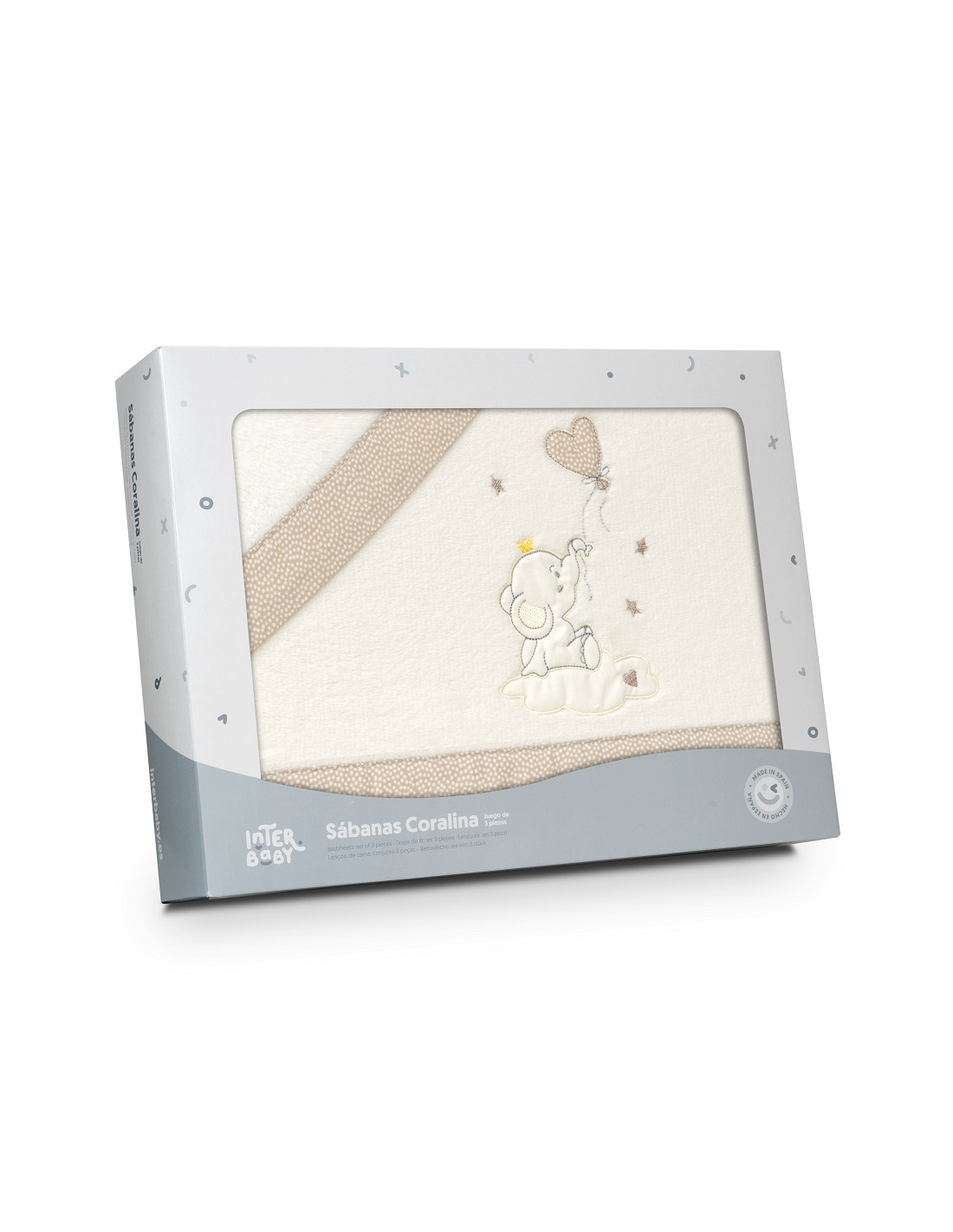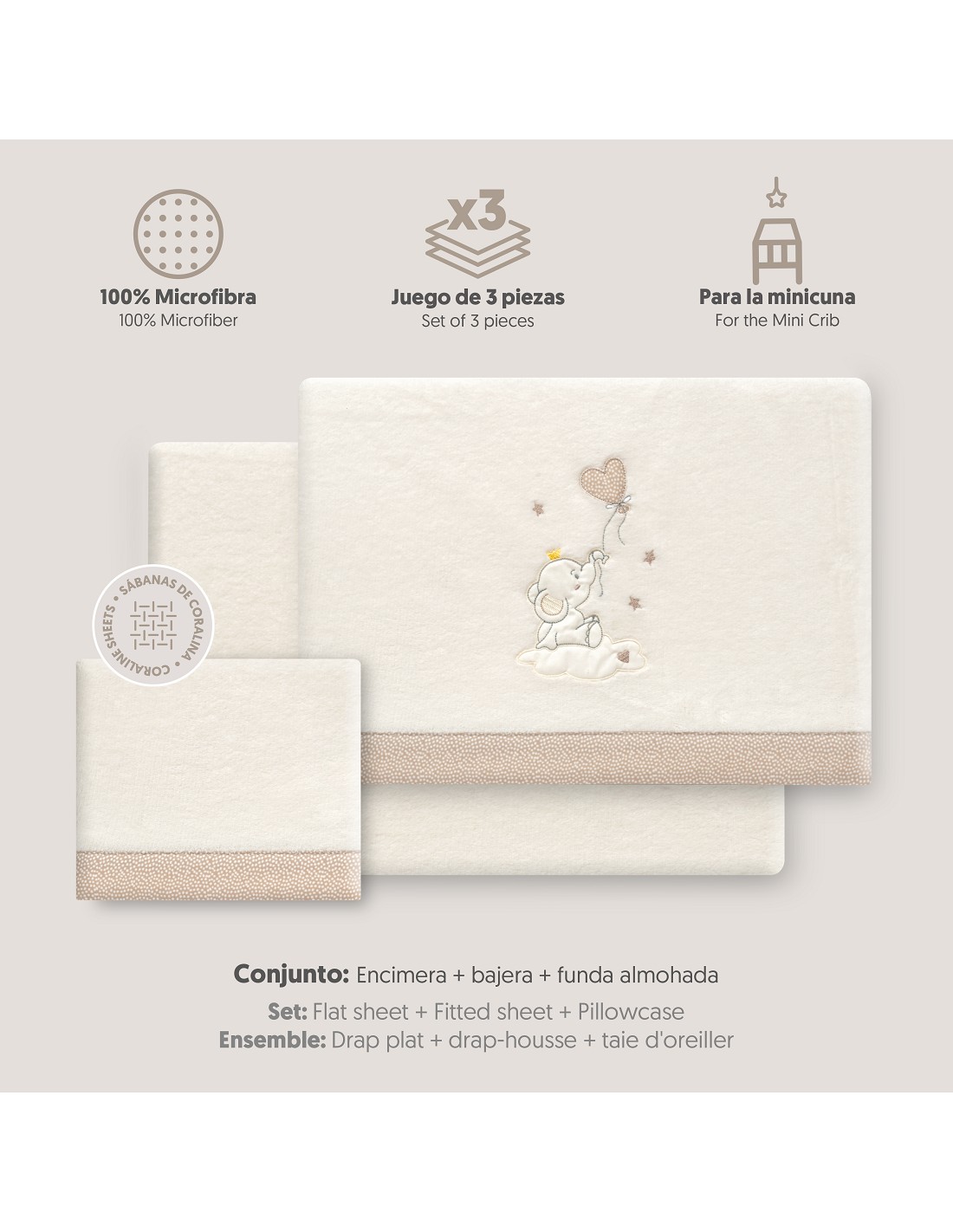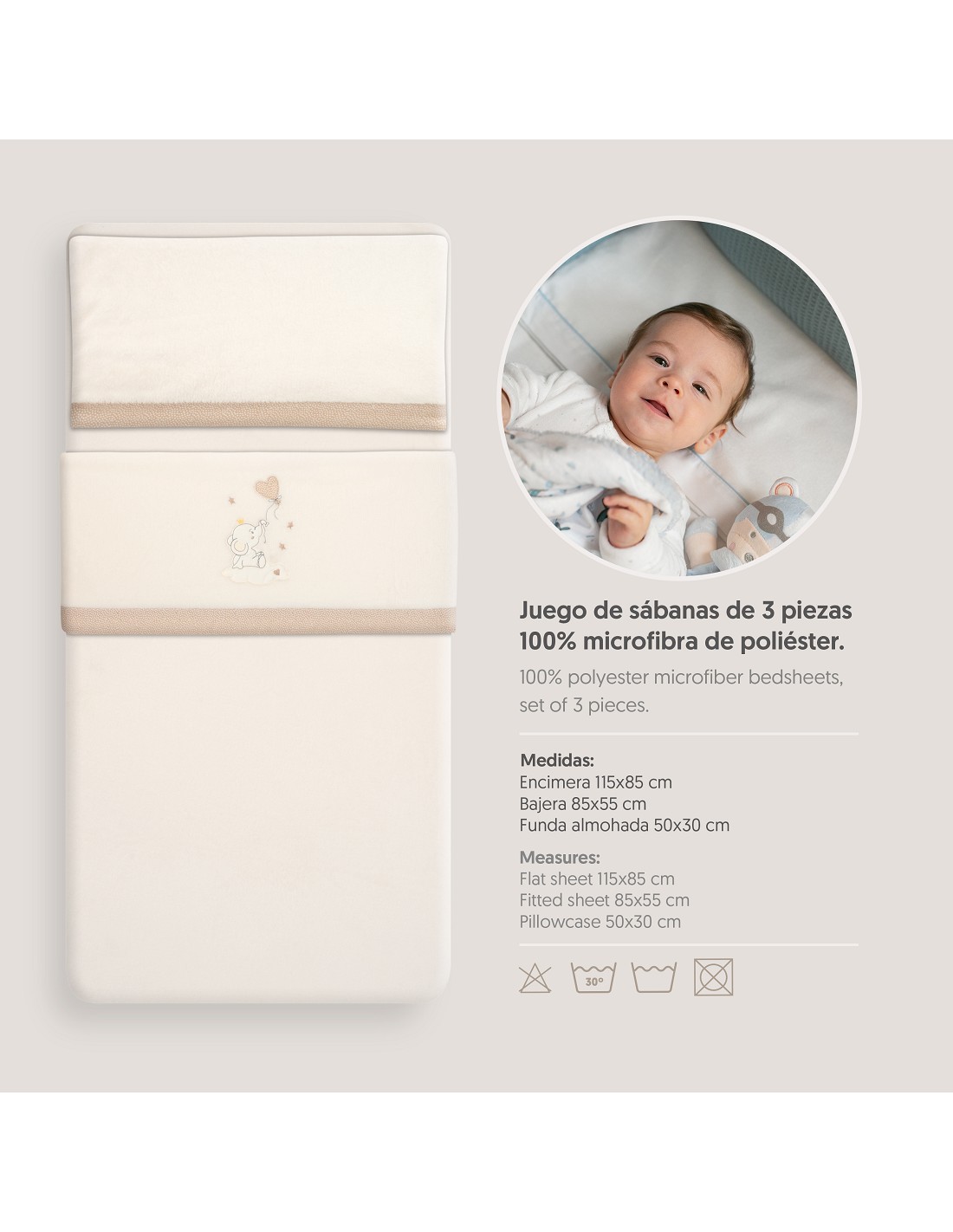 Compuesto por encimera (82 x 114 cm) , bajera (50 x 80 cm) y funda de almohada (50 x 30 cm). 100 % poliester. Lavar en frío.