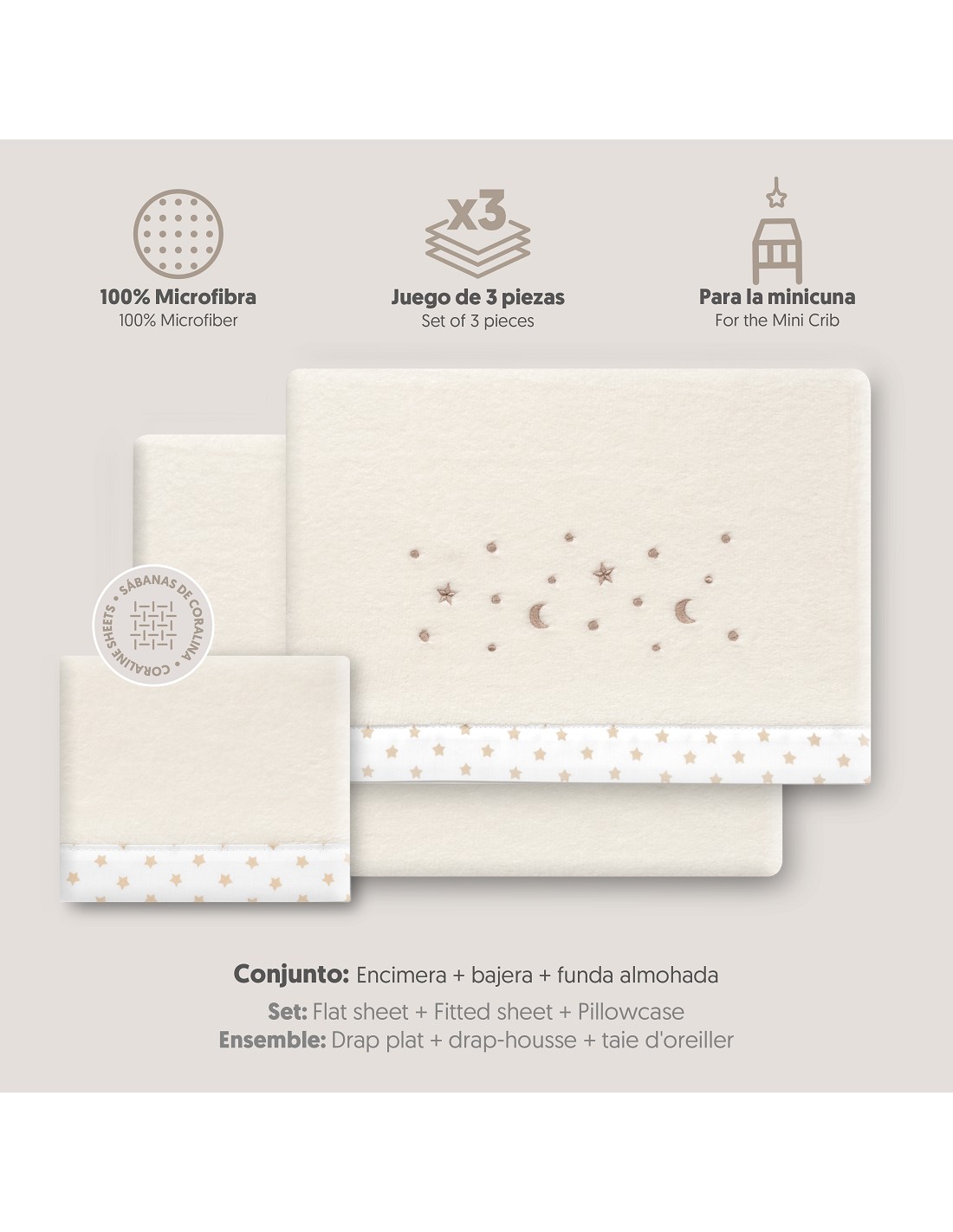 Compuesto por encimera (82 x 114 cm) , bajera (50 x 80 cm) y funda de almohada (50 x 30 cm). 100 % poliester. Lavar en frío.
