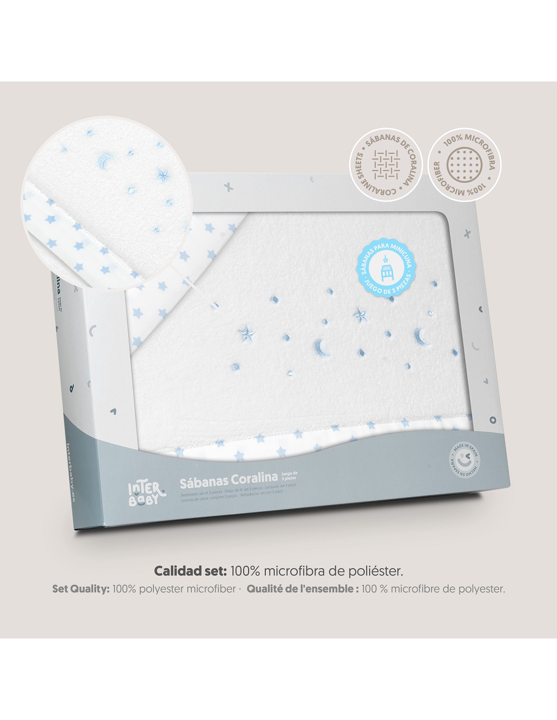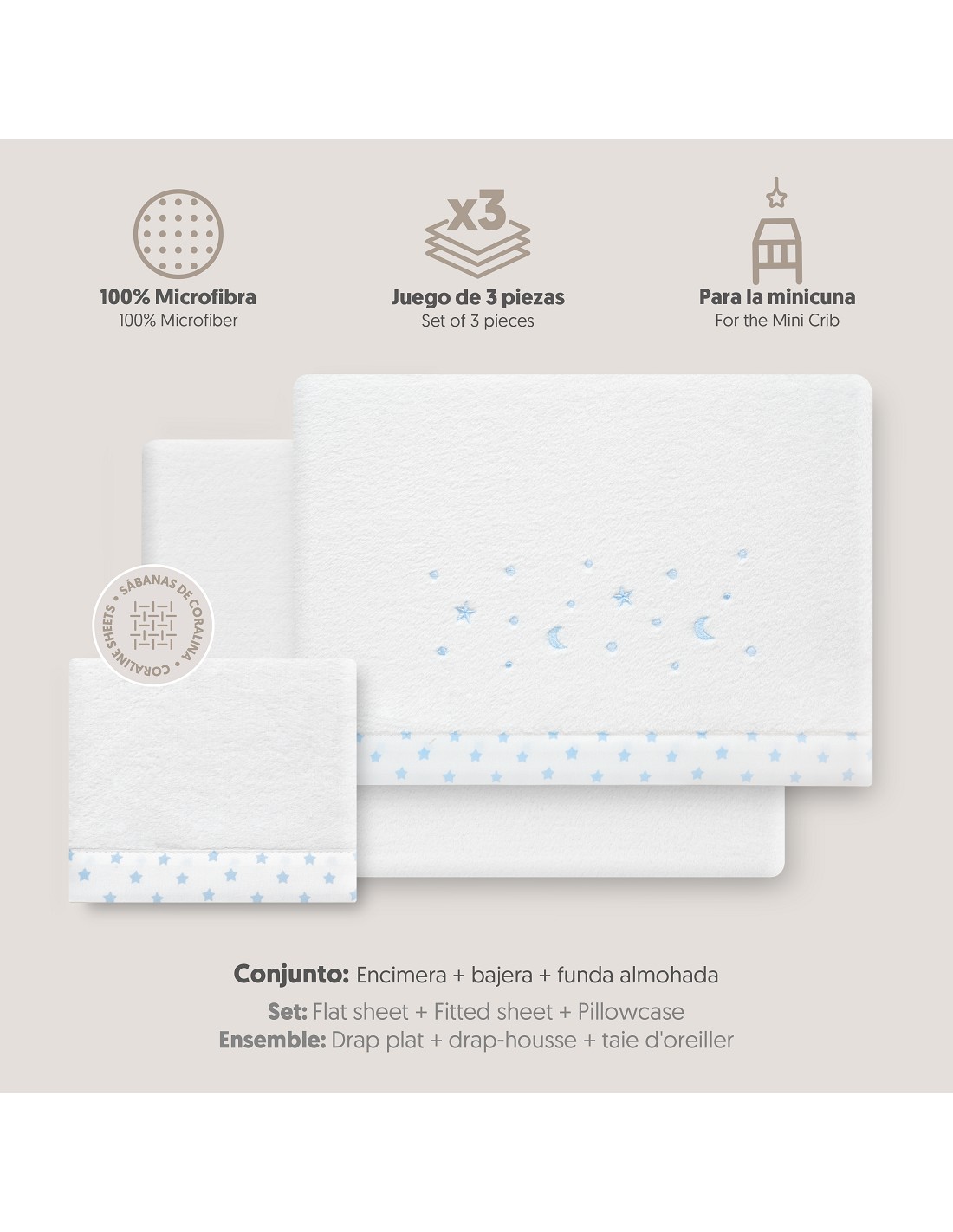 Compuesto por encimera (82 x 114 cm) , bajera (50 x 80 cm) y funda de almohada (50 x 30 cm). 100 % poliester. Lavar en frío.