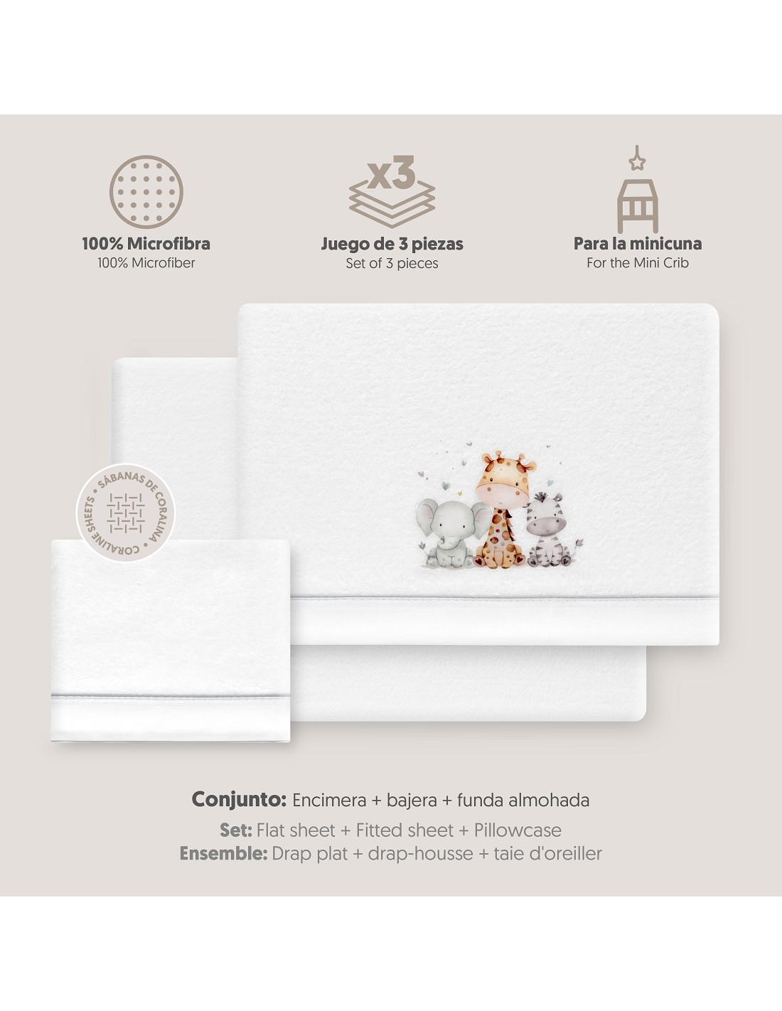 Compuesto por encimera (82 x 114 cm) , bajera (50 x 80 cm) y funda de almohada (50 x 30 cm). 100 % poliester. Lavar en frío.