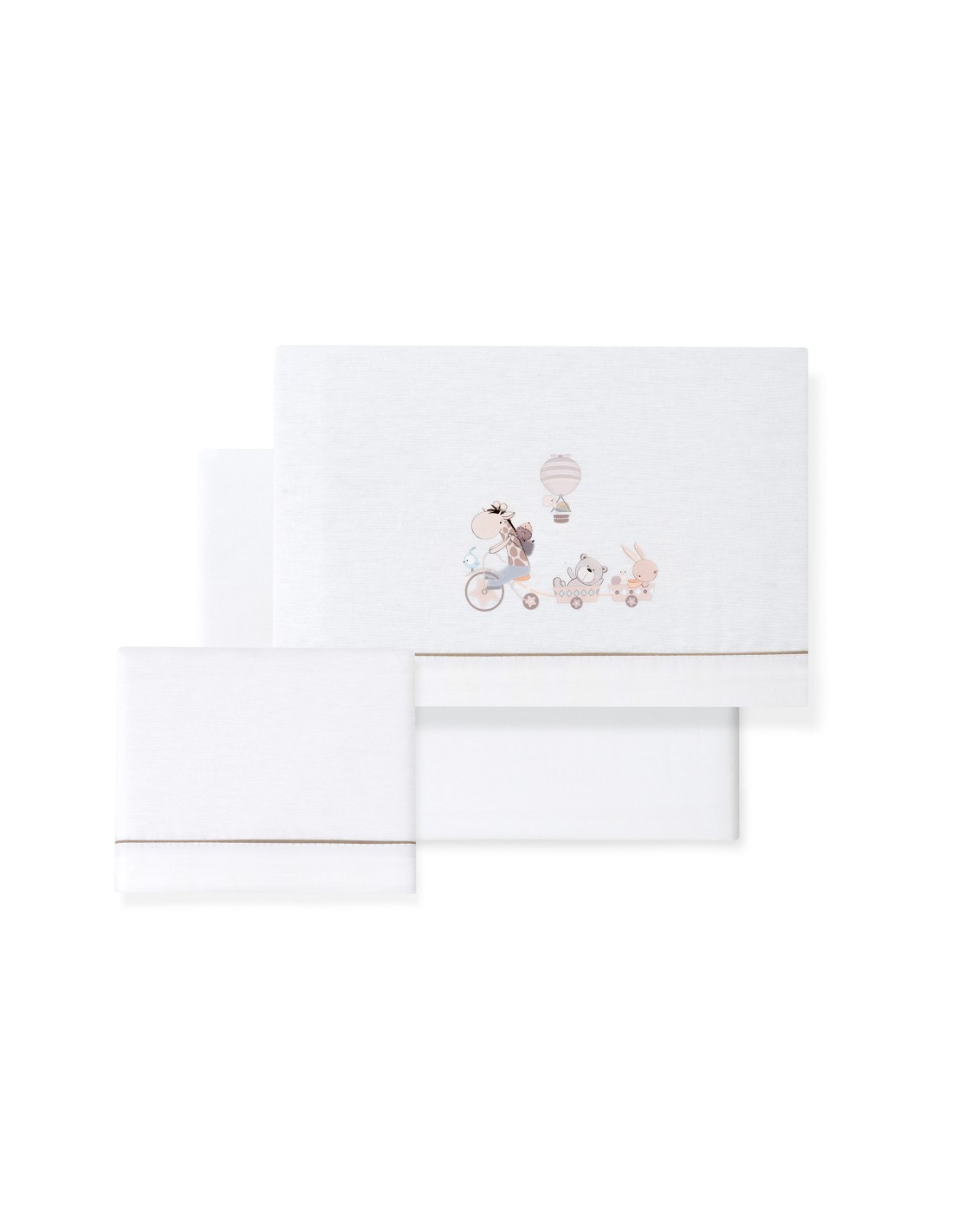 Compuesto por encimera (82 x 114 cm) , bajera (50 x 80 cm) y funda de almohada (50 x 30 cm). 100 % algodón. Lavar en frío.