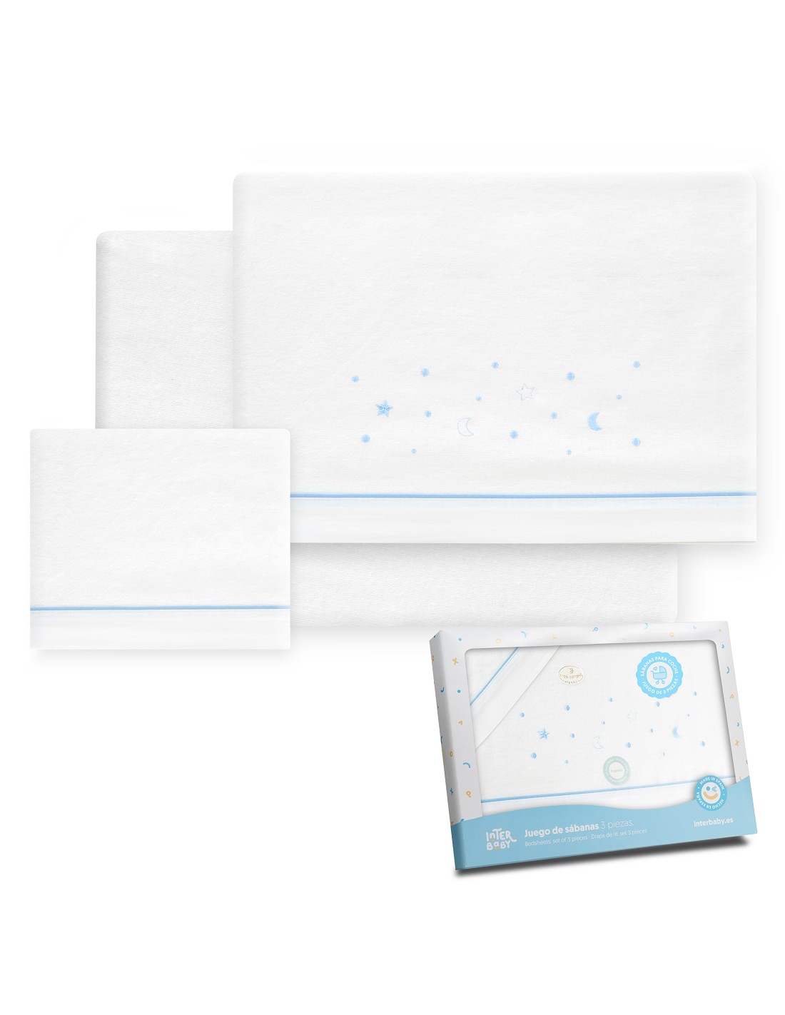 Compuesto por encimera (82 x 114 cm) , bajera (50 x 80 cm) y funda de almohada (50 x 30 cm). 100 % algodón. Lavar en frío.