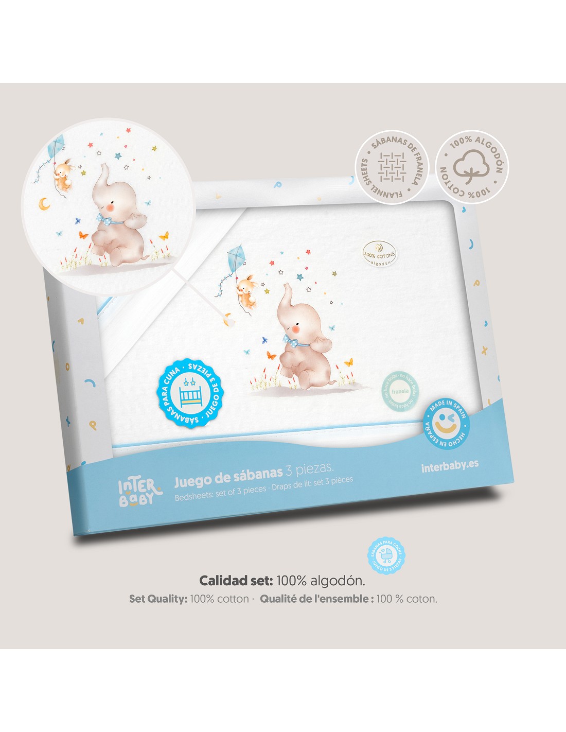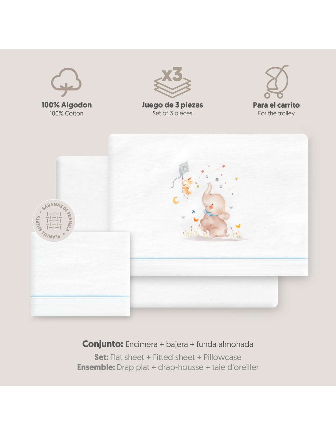 Compuesto por encimera (82 x 114 cm) , bajera (50 x 80 cm) y funda de almohada (50 x 30 cm). 100 % algodón. Lavar en frío.