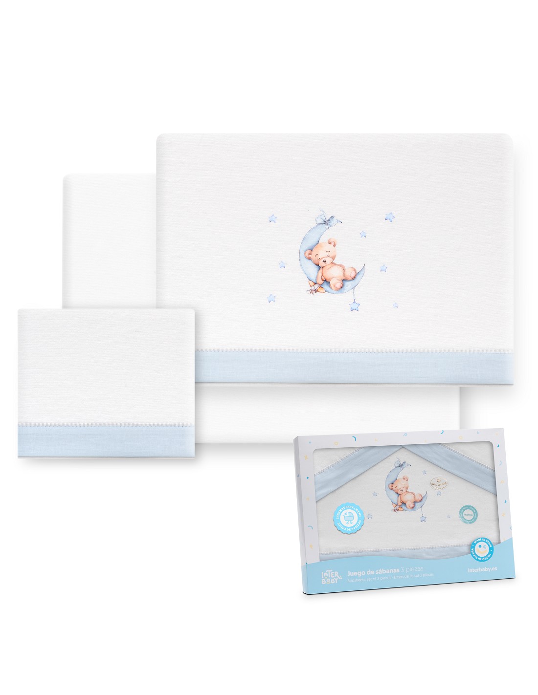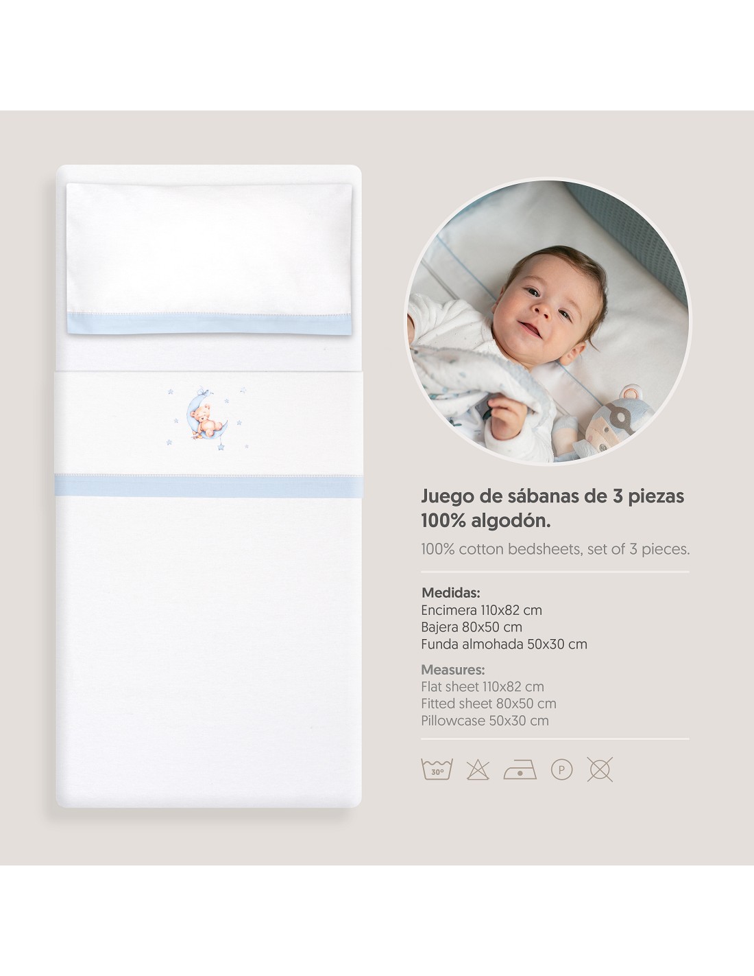 Compuesto por encimera (82 x 114 cm) , bajera (50 x 80 cm) y funda de almohada (50 x 30 cm). 100 % algodón. Lavar en frío.