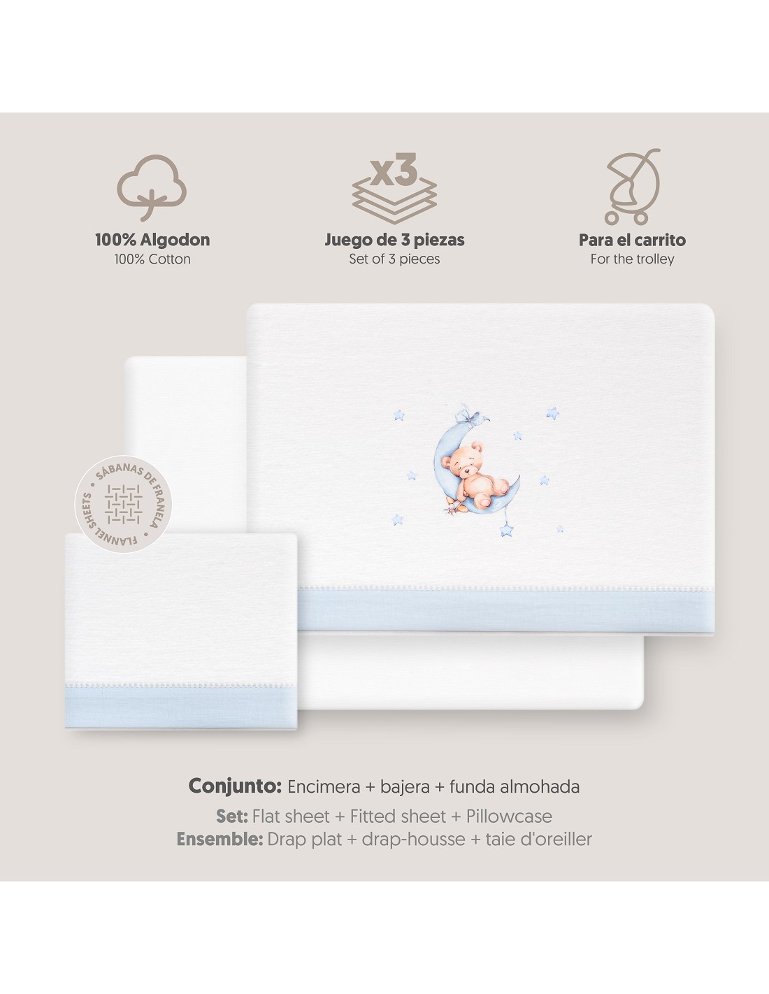 Triptico Coche Franela Estampado Oso Luna Estrellas Bco/Azul