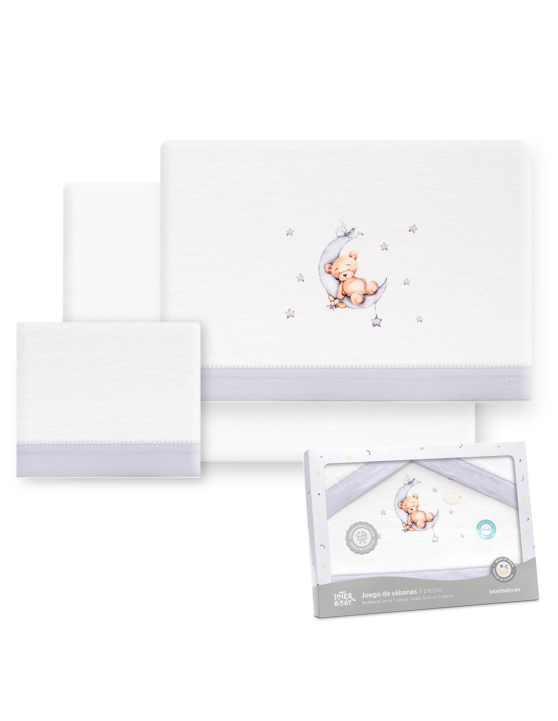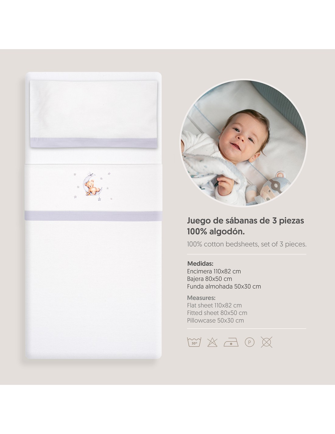 Compuesto por encimera (82 x 114 cm) , bajera (50 x 80 cm) y funda de almohada (50 x 30 cm). 100 % algodón. Lavar en frío.