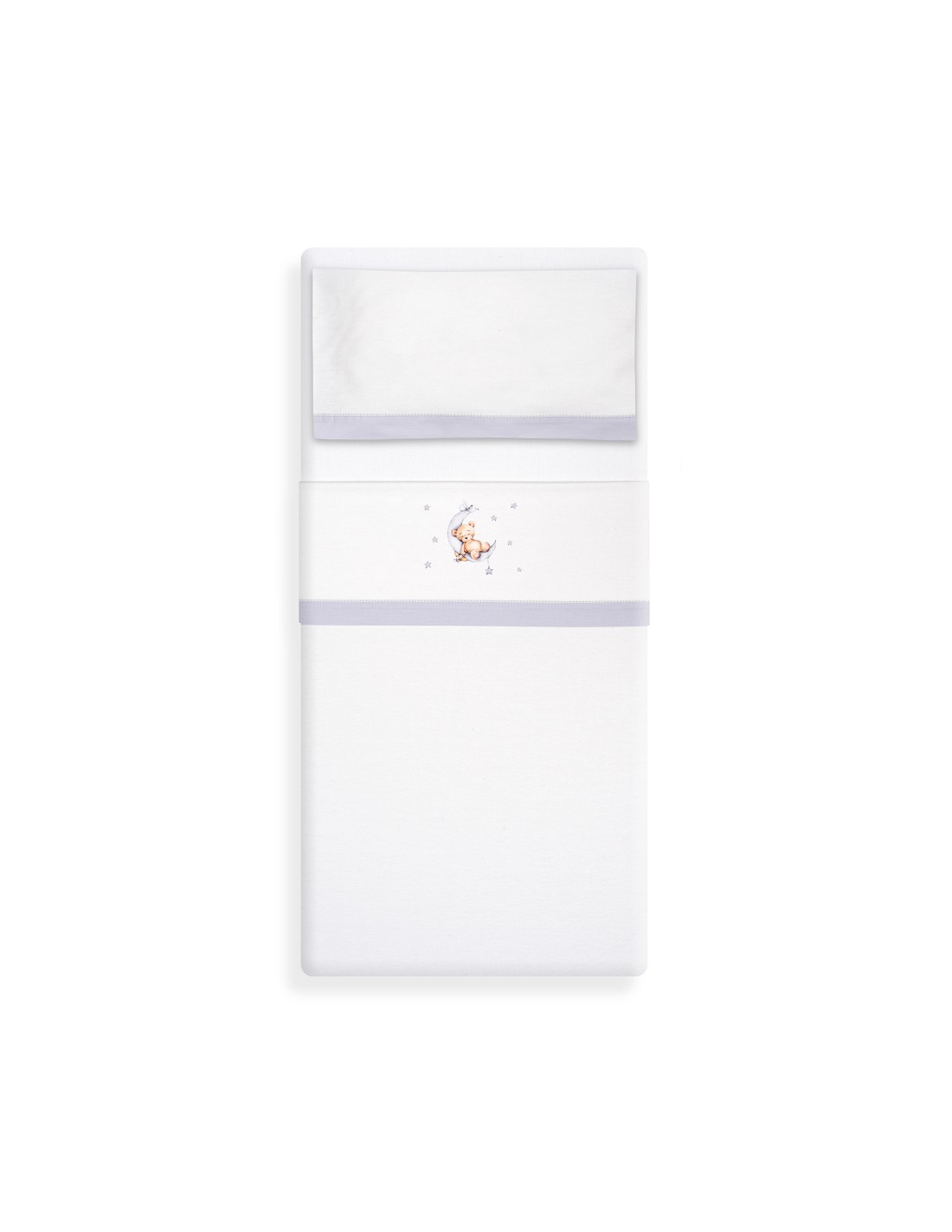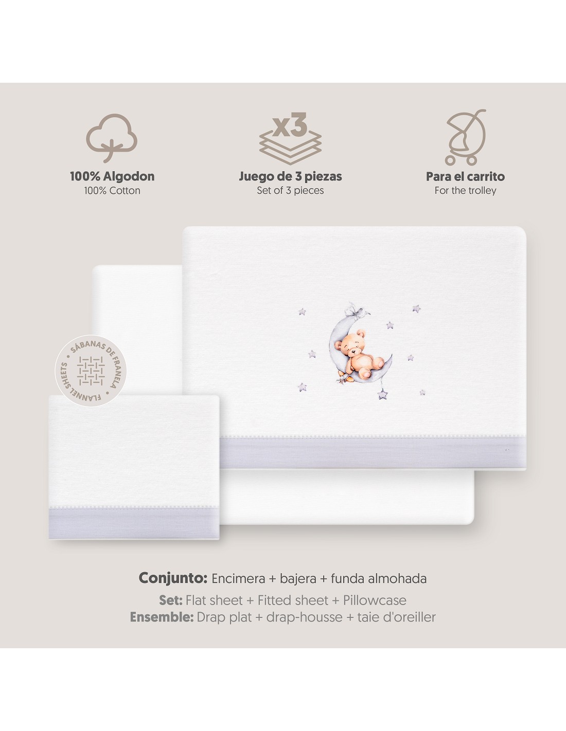 Triptico Coche Franela Estampado Oso Luna Estrellas Bco/Gris