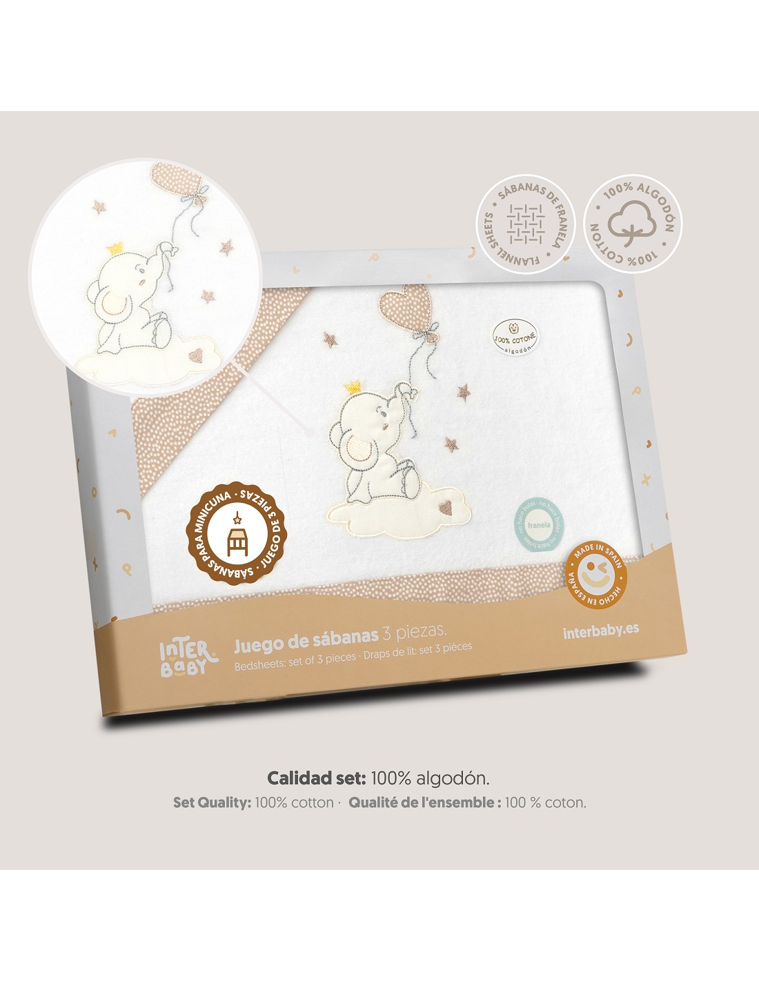 Triptico Minicuna Franela Elefante Globo Corazon Bco/Beig