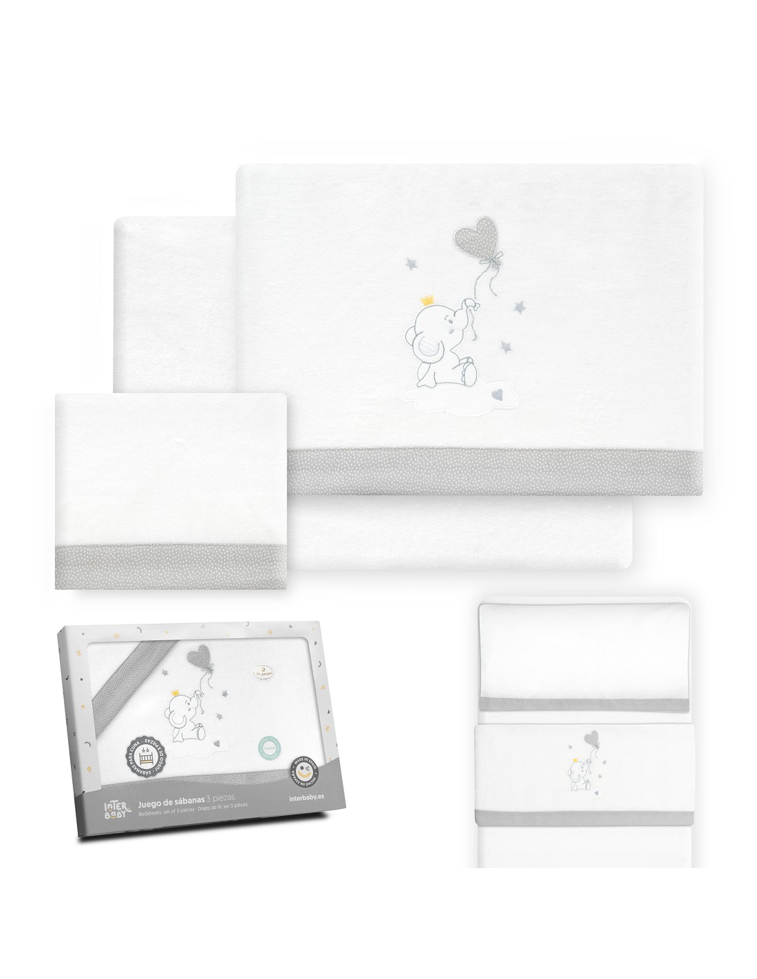 Triptico Minicuna Franela Elefante Globo Corazon Bco/Gris