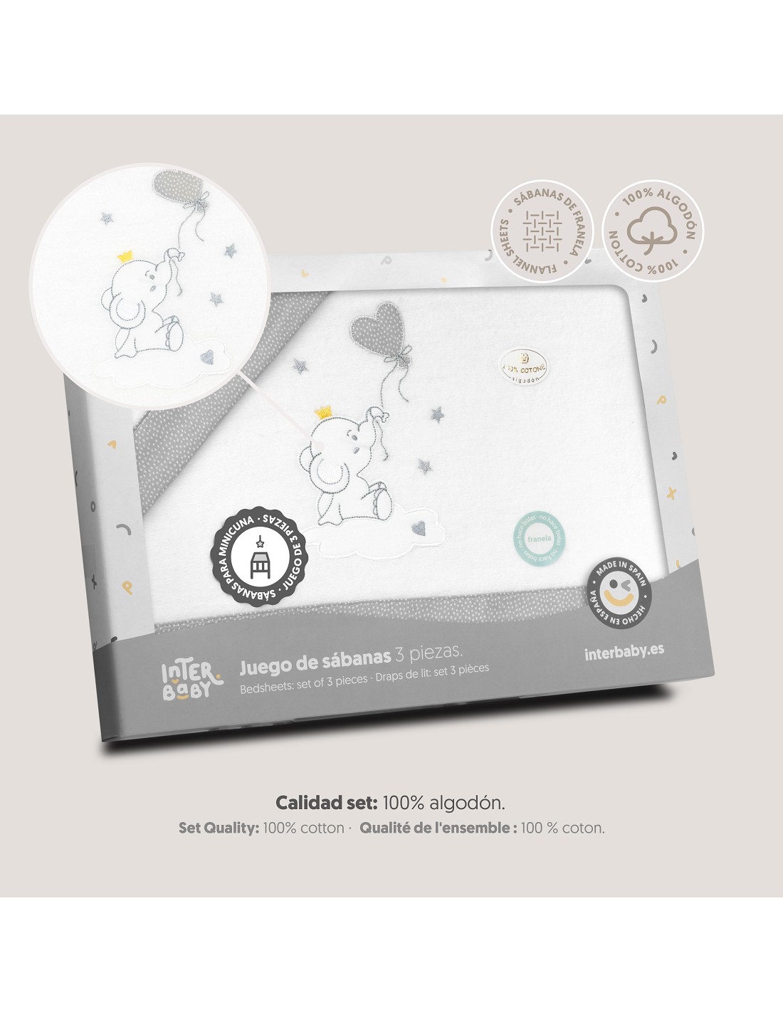 Compuesto por encimera (82 x 114 cm) , bajera (50 x 80 cm) y funda de almohada (50 x 30 cm). 100 % algodón. Lavar en frío.