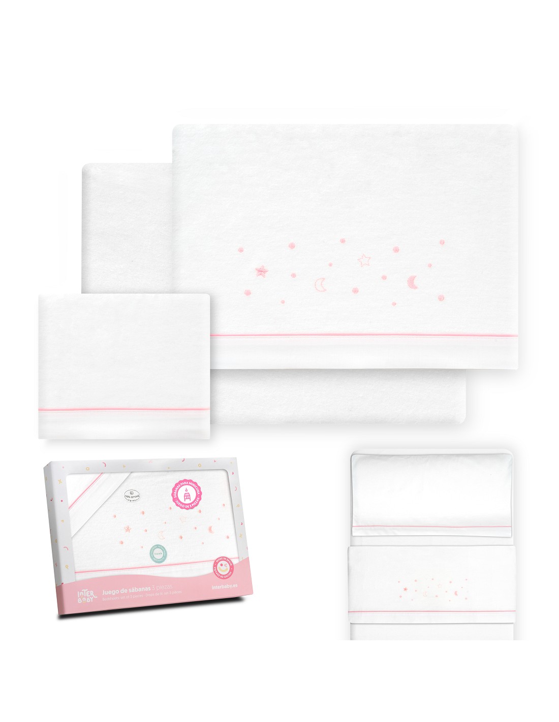 Compuesto por encimera (82 x 114 cm) , bajera (50 x 80 cm) y funda de almohada (50 x 30 cm). 100 % algodón. Lavar en frío.