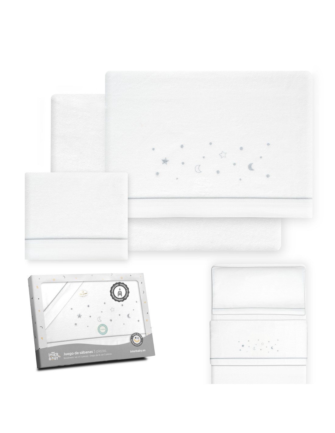 Compuesto por encimera (82 x 114 cm) , bajera (50 x 80 cm) y funda de almohada (50 x 30 cm). 100 % algodón. Lavar en frío.