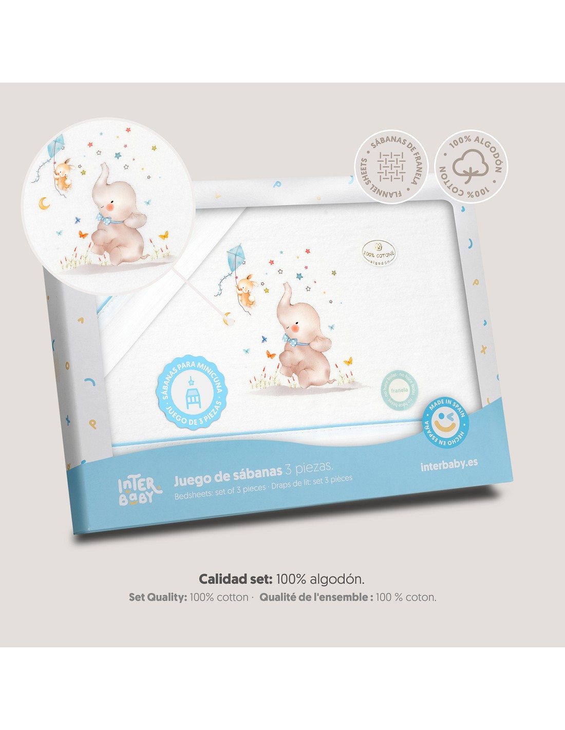 Compuesto por encimera (82 x 114 cm) , bajera (50 x 80 cm) y funda de almohada (50 x 30 cm). 100 % algodón. Lavar en frío.