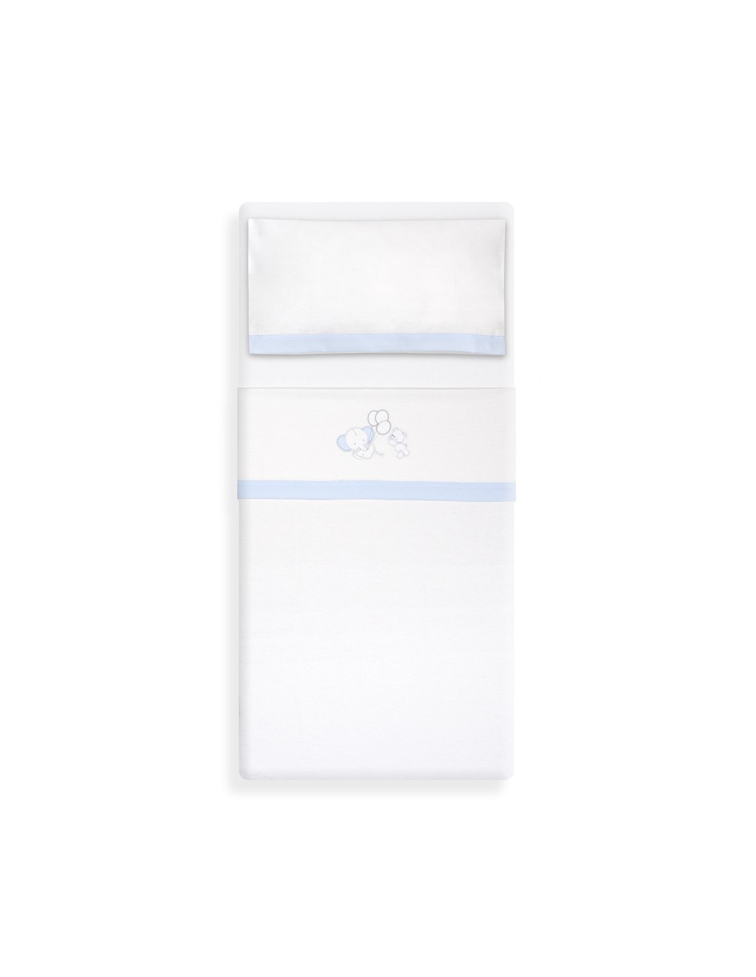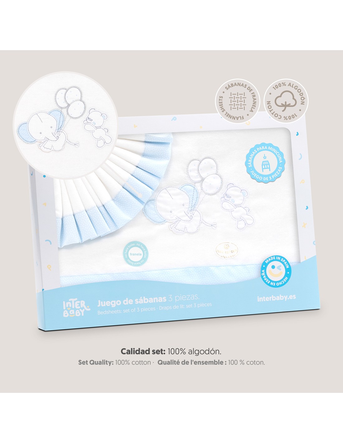 Compuesto por encimera (82 x 114 cm) , bajera (50 x 80 cm) y funda de almohada (50 x 30 cm). 100 % algodón. Lavar en frío.