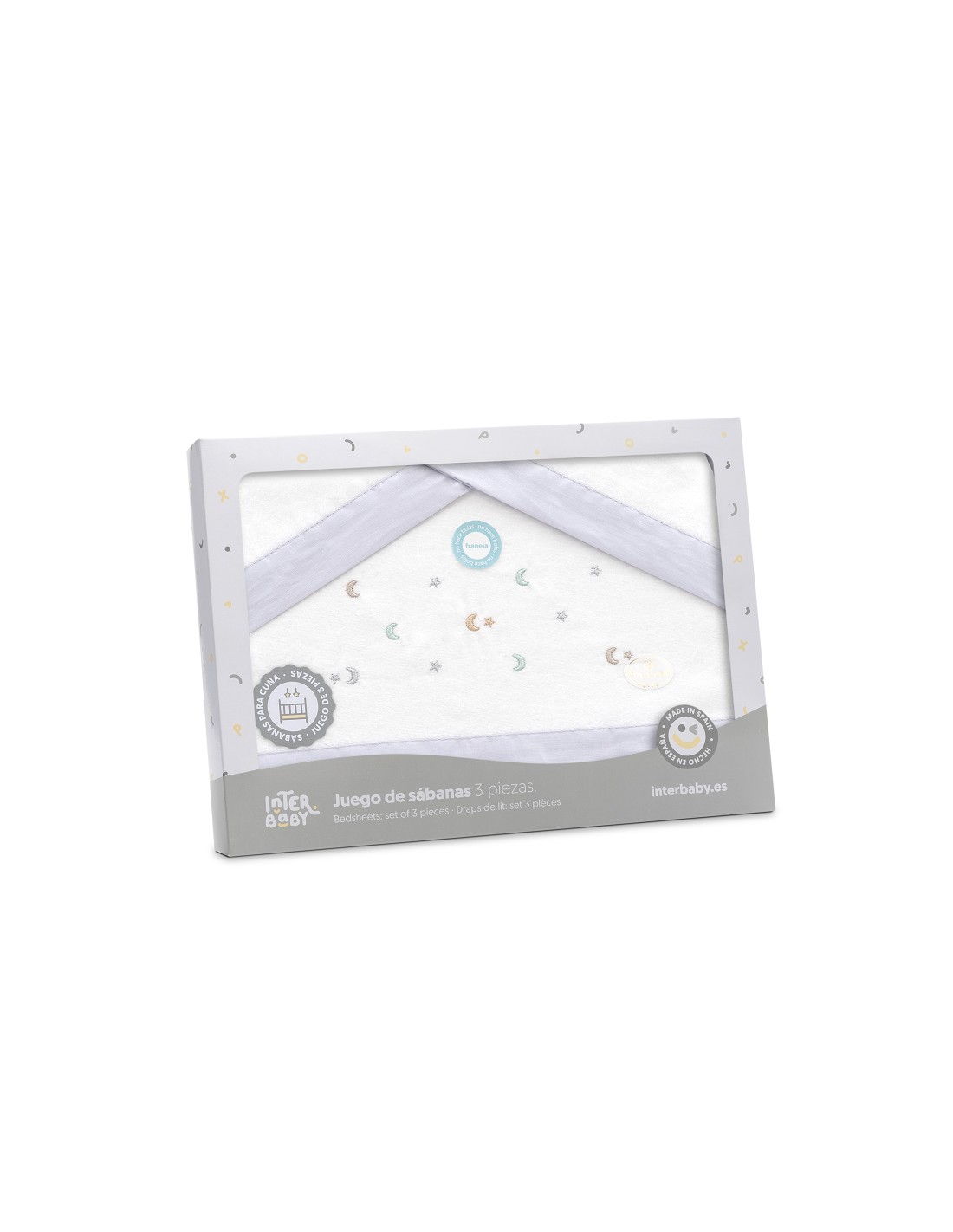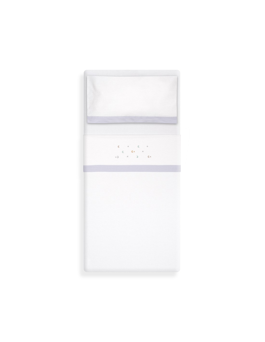 Compuesto por encimera (82 x 114 cm) , bajera (50 x 80 cm) y funda de almohada (50 x 30 cm). 100 % algodón. Lavar en frío.