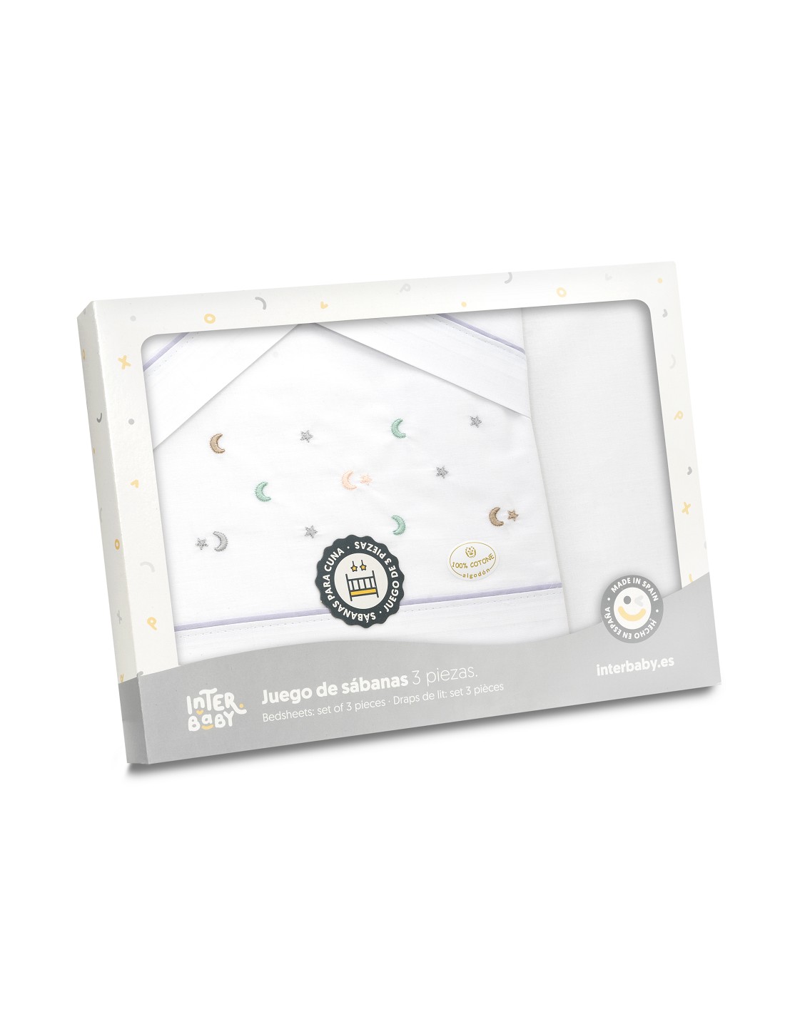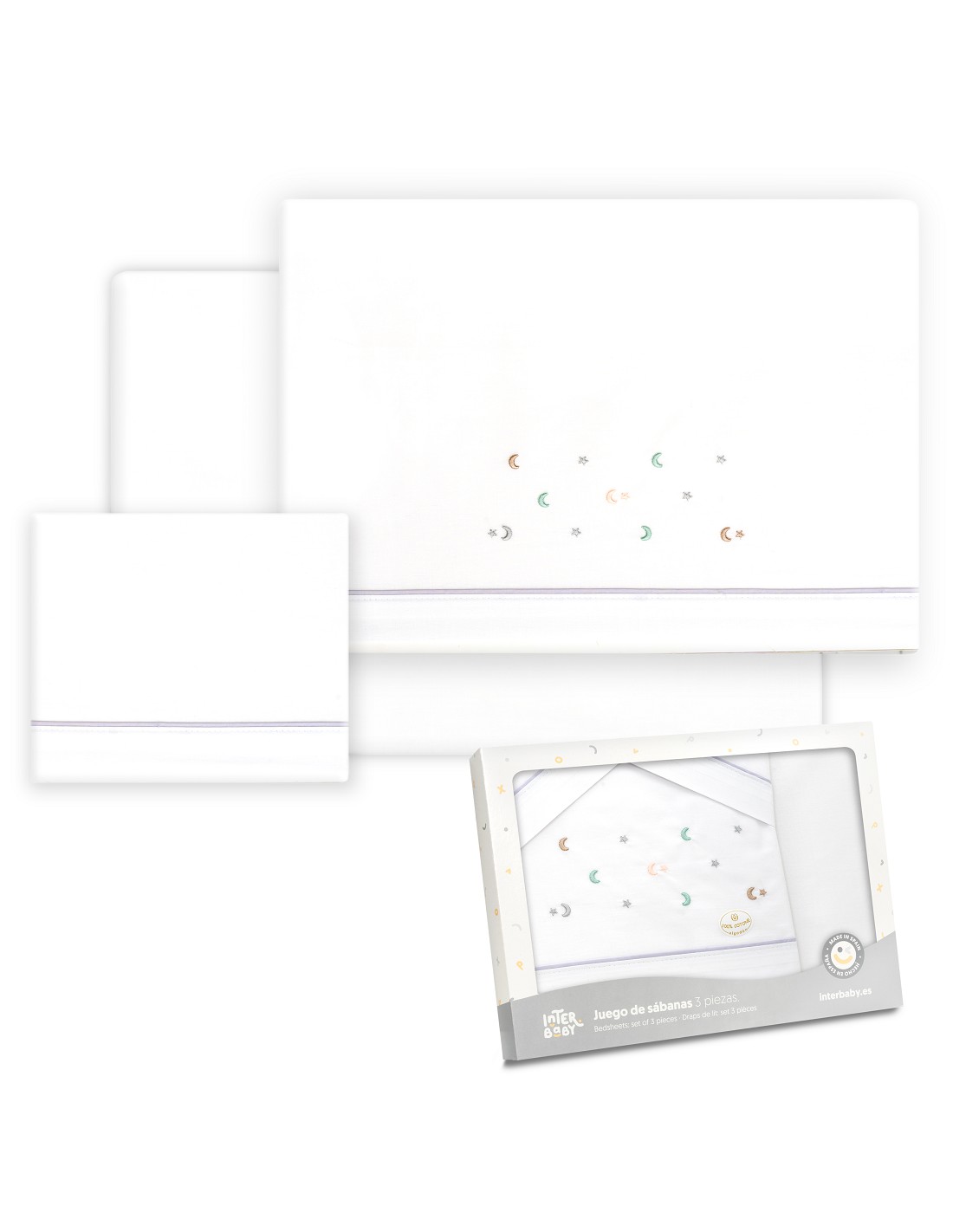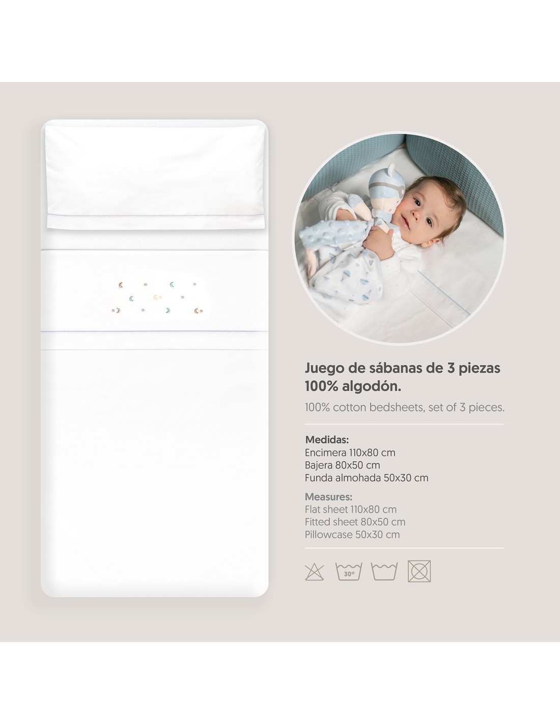 Compuesto por encimera (72 X 114cm) , bajera (40 X 80 cm) y funda de almohada (40 x 25 cm). 100 % algodón. Lavar en frío.