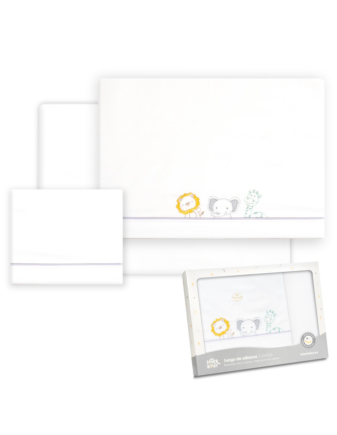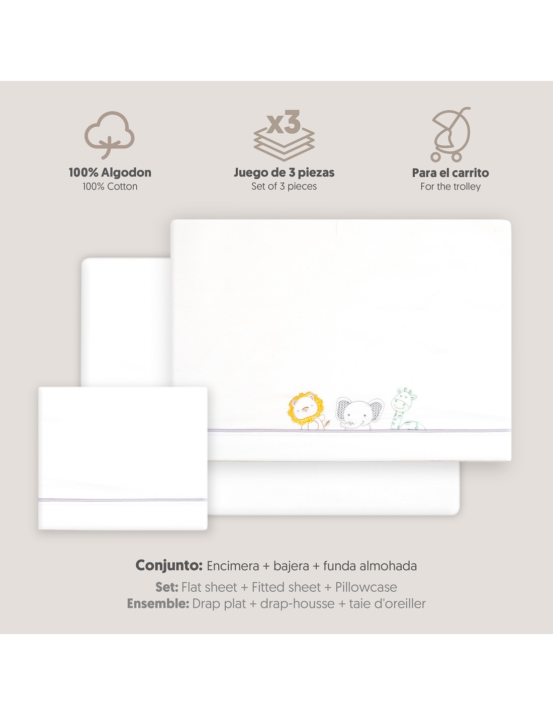 Compuesto por encimera (72 X 114cm) , bajera (40 X 80 cm) y funda de almohada (40 x 25 cm). 100 % algodón. Lavar en frío.
